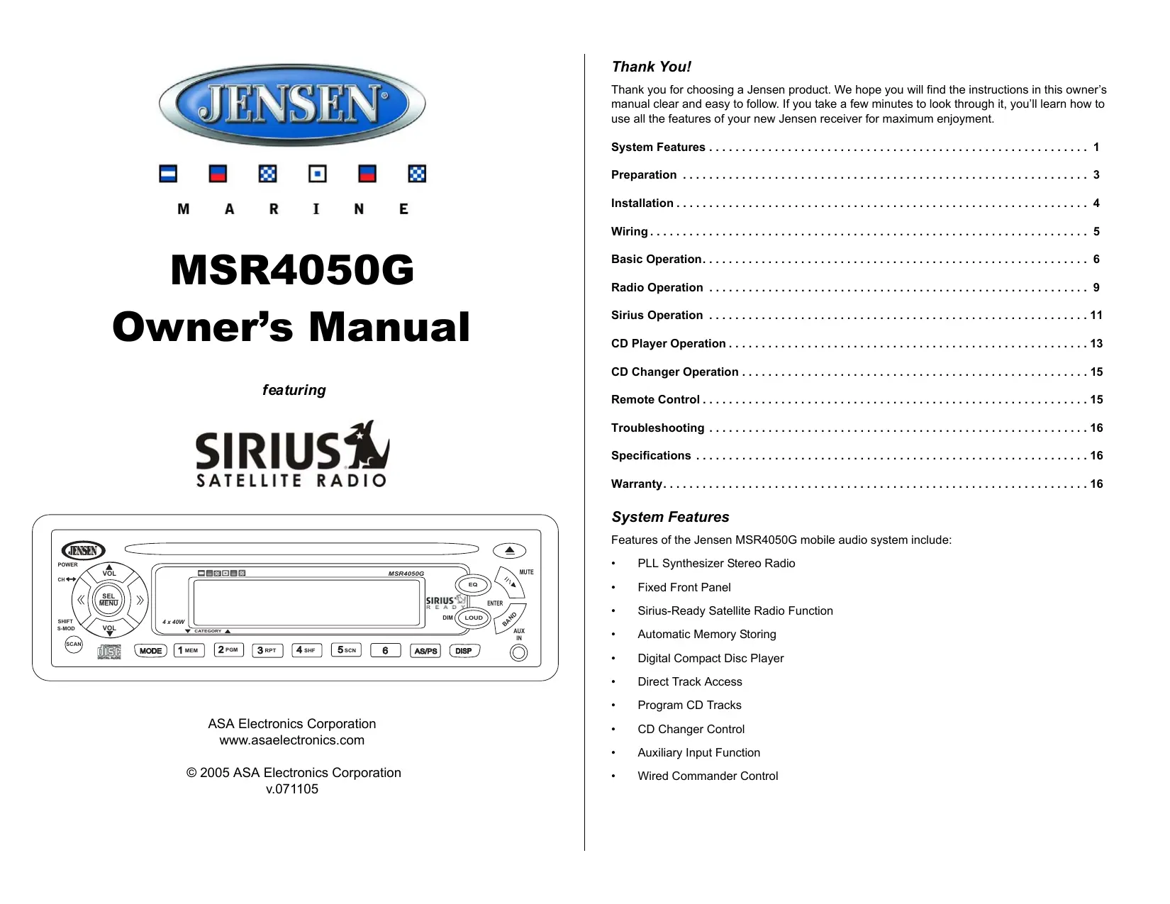 - Wired Commander Control MSR4050G Guide d'Utilisateur Manual del Usuario ¡Gracias! Merci! Gracias por elegir los productos Jensen. Esperamos que encuentre en este manual instrucciones claras y fáciles de seguir. Si se toma unos pocos minutos para leerlo, aprenderá cómo utilizar todas las funciones de su nuevo radio Jensen para su máximo entretenimiento. Merci d'avoir choisi un produit Jensen. Nous espérons que vous allez trouver les instructions dans ce guide de propriétaire claires et faciles à suivre. Prenez quelques minutes à le consulter, vous apprendrez à utiliser toutes les fonctions de radio Jensen pour en tirer une jouissance maximum. Funciones del Sistema p. 2