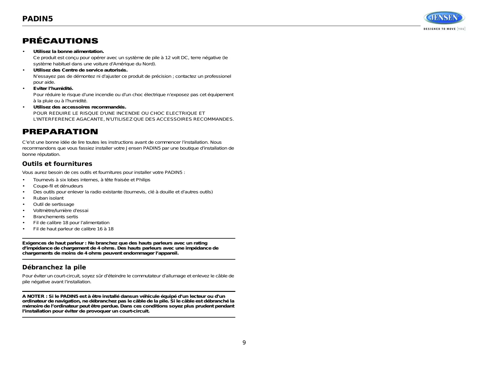 Utilisez la bonne alimentation. Ce produit est conçu pour opérer avec un système de pile à 12 volt DC, terre négative (le système habituel dans une voiture d’Amérique du Nord). Utilisez des Centre de service autorisés. N’essayez pas de démontez ni d’ajuster ce produit de précision ; contactez un professionel pour aide. Eviter l’humidité. Pour réduire le risque d’une incendie ou d’un choc électrique n’exposez pas cet équipement à la pluie ou à l’humidité. Utilisez des accessoires recommandés. POUR REDUIRE LE RISQUE D’UNE INCENDIE OU CHOC ELECTRIQUE ET L’INTERFERENCE AGACANTE, N’UTILISEZ QUE DES ACCESSOIRES RECOMMANDES. PREPARATION C’e’st une bonne idée de lire toutes les instructions avant de commencer l’installation. Nous recommandons que vous fassiez installer votre Jensen PADIN5 par une boutique d’installation de bonne réputation. Outils et fournitures Vous aurez besoin de ces outils et fournitures pour installer votre PADIN5 :
