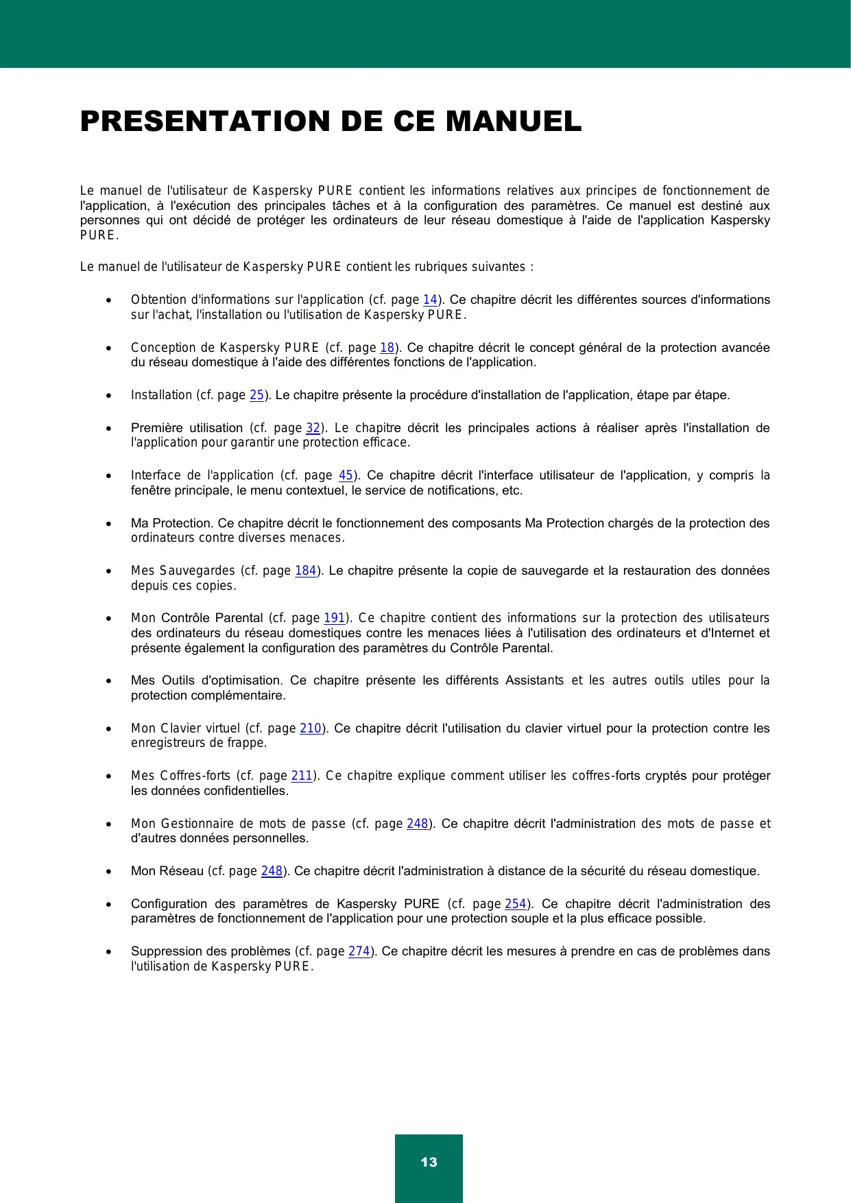 Le manuel de l'utilisateur de Kaspersky PURE contient les informations relatives aux principes de fonctionnement de l'application, à l'exécution des principales tâches et à la configuration des paramètres. Ce manuel est destiné aux personnes qui ont décidé de protéger les ordinateurs de leur réseau domestique à l'aide de l'application Kaspersky PURE. Le manuel de l'utilisateur de Kaspersky PURE contient les rubriques suivantes :