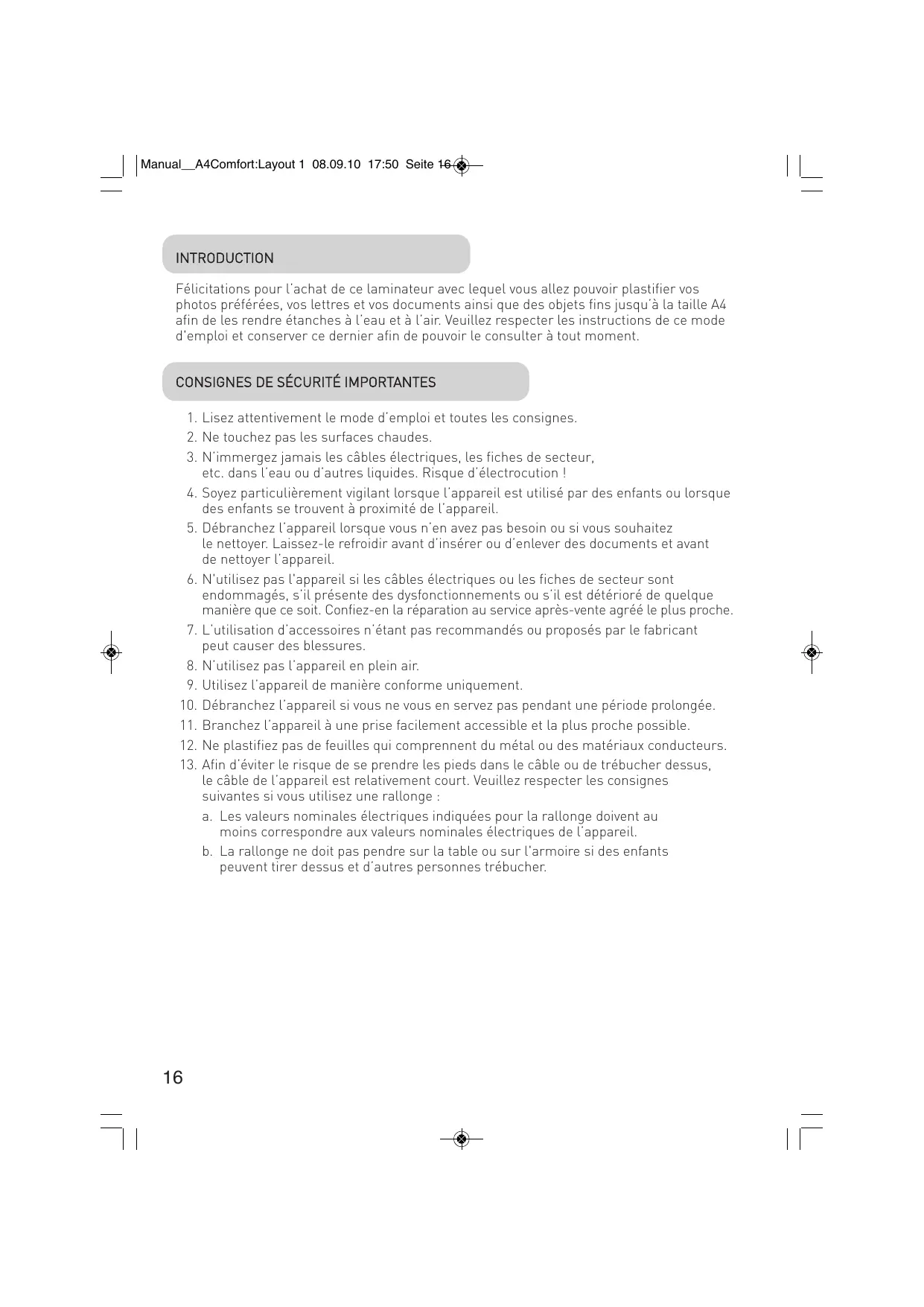INTRODUCTION Félicitations pour l’achat de ce laminateur avec lequel vous allez pouvoir plastifier vos photos préférées, vos lettres et vos documents ainsi que des objets fins jusqu’à la taille A4 afin de les rendre étanches à l’eau et à l’air. Veuillez respecter les instructions de ce mode d'emploi et conserver ce dernier afin de pouvoir le consulter à tout moment.