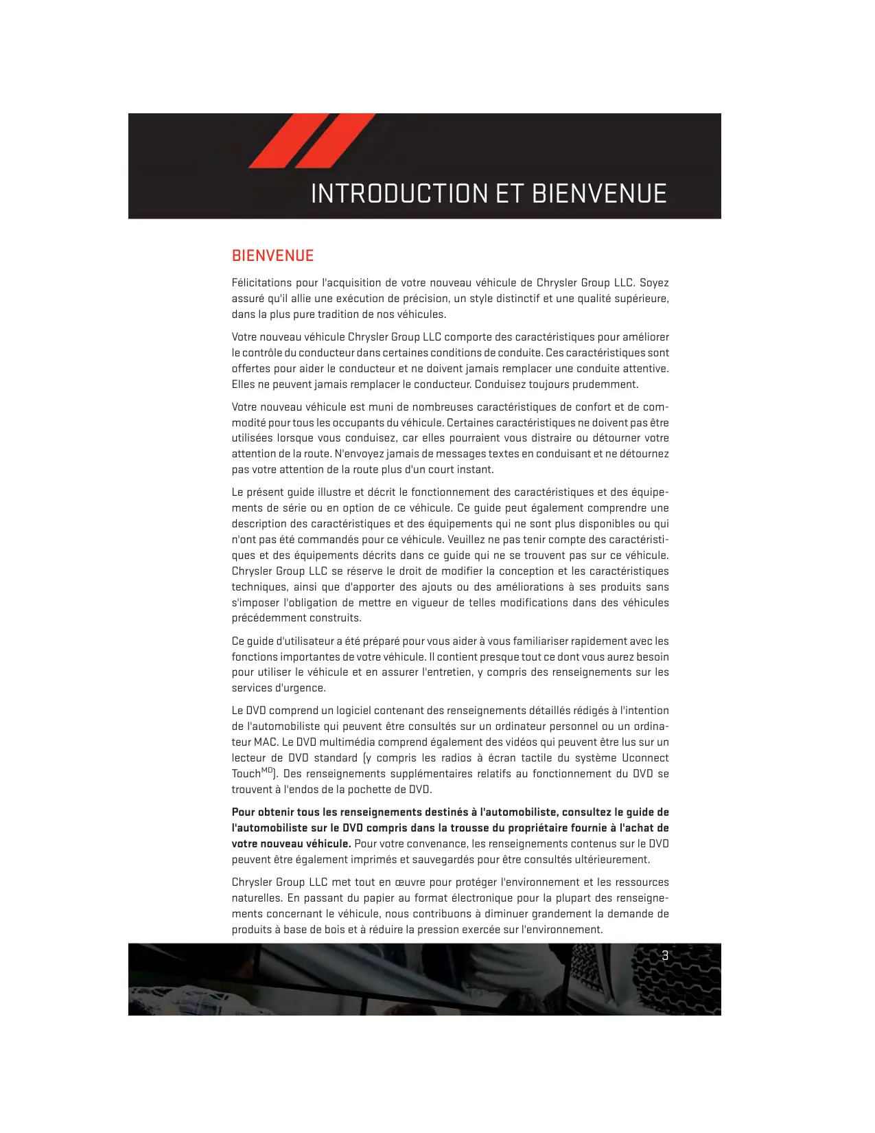 Félicitations pour l'acquisition de votre nouveau vehicule de Chrysler Group LLC. Soyez assure qu'il allie une exécution de précision, un style distinctif et une qualité supérieur, dans la plus pure tradition de nos vehicules.