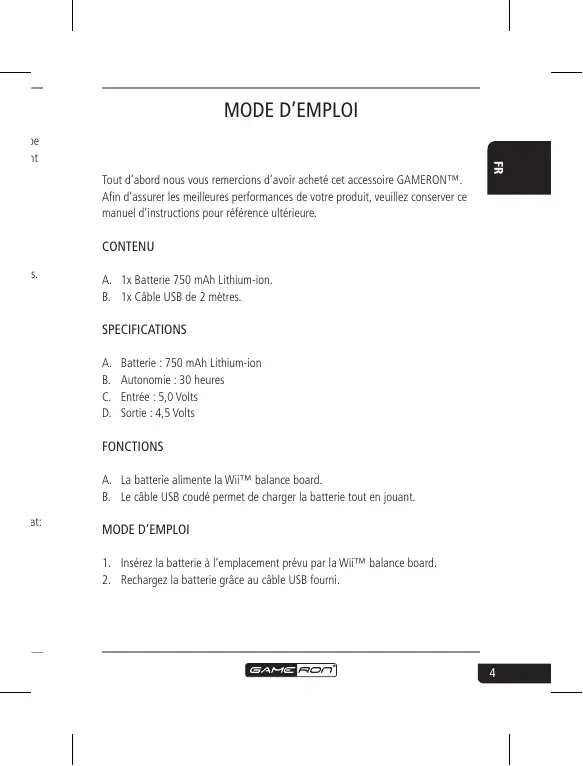Batterie : 750 mAh Lithium-ion Autonomie : 30 heures Entrée : 5,0 Volts Sortie : 4,5 Volts FONCTIONS A. La batterie alimente la Wii™ balance board. B. Le câble USB coudé permet de charger la batterie tout en jouant.