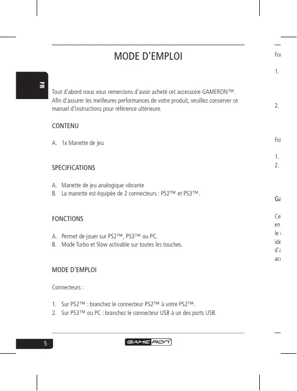 ralent A. Manette de jeu analogique vibrante B. La manette est équipée de 2 connecteurs : PS2™ et PS3™. FONCTIONS A. Permet de jouer sur PS2™, PS3™ ou PC. B. Mode Turbo et Slow activable sur toutes les touches.