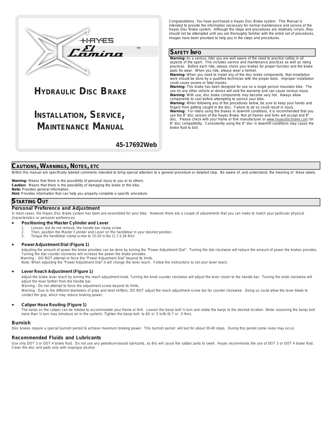 45-17692ECFULL - Freins à disque HAYES DISC BRAKES - Notice d'utilisation et mode d'emploi gratuit