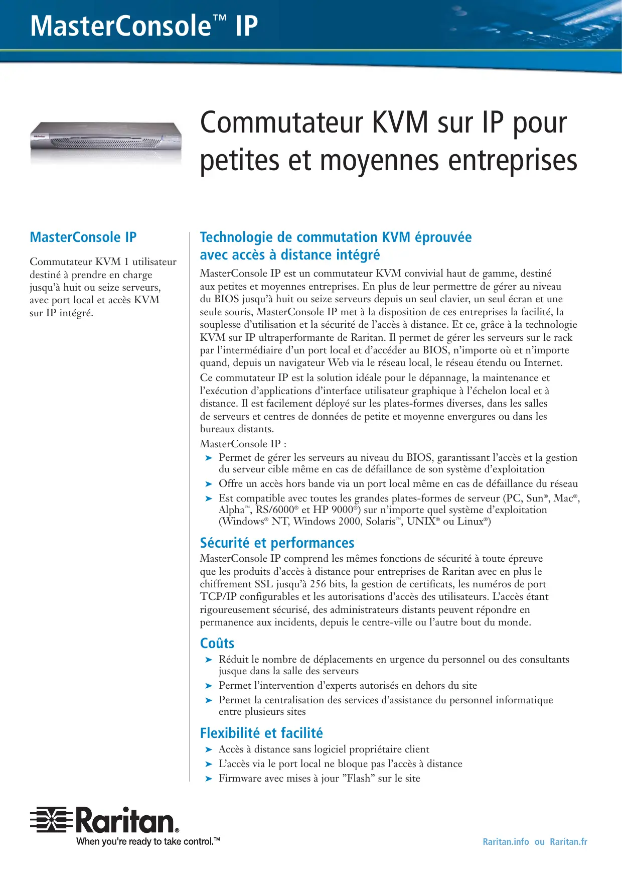 MasterConsole IP est un commutateur KVM convivial haut de gamme, destiné aux petites et moyennes entreprises. En plus de leur permettre de gérer au niveau du BIOS jusqu'à huit ou seize serveurs depuis un seul clavier, un seul écran et une seule souris, MasterConsole IP met à la disposition de ces entreprises la facilité, la souplesse d'utilisation et la sécurité de l'accès à distance. Et ce, grâce à la technologie KVM sur IP ultraperformante de Raritan. Il permet de gérer les serveurs sur le rack par l'intermédiaire d'un port local et d'accéder au BIOS, n'importe où et n'importe quand, depuis un navigateur Web via le réseau local, le réseau étendu ou Internet.