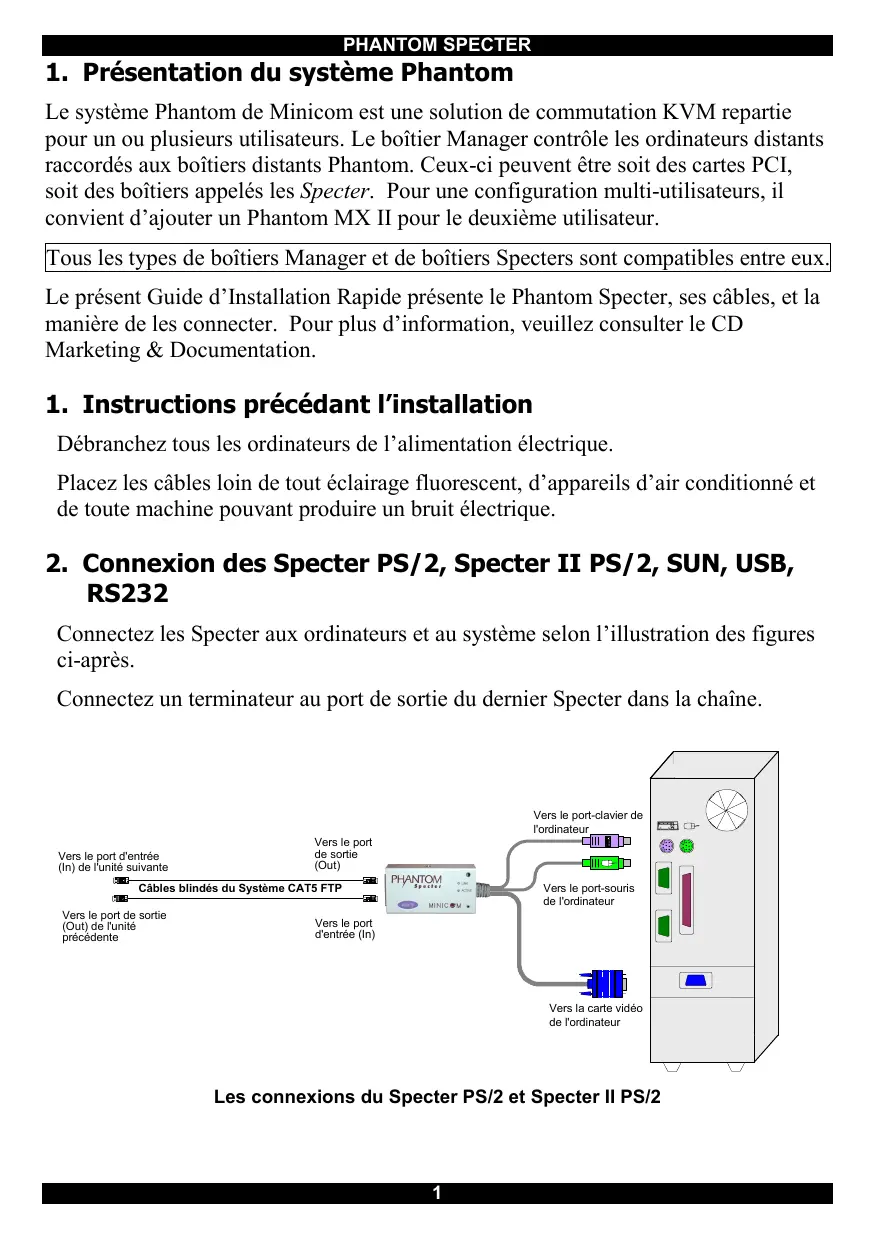 Le système Phantom de Minicom est une solution de commutation KVM répartie pour un ou plusieurs utilisateurs. Le boîtier Manager contrôle les ordinateurs distants raccordés aux boîtiers distants Phantom. Ceux-ci peuvent être soit des cartes PCI, soit des boîtiers appelés les Specter. Pour une configuration multi-utilisateurs, il convient d'ajouter un Phantom MX II pour le deuxième utilisateur.