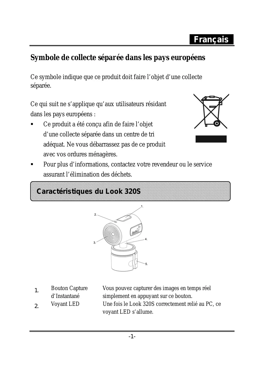 Français Note: Si l’écran d’installation n’apparaît pas automatiquement, procédez comme suit : z Cliquez sur “Démarrer” z Entrez le chemin d’accès D:\SETUP.EXE, puis appuyez sur la touche entrée. (D représente l’emplacement de votre lecteur CD-ROM) Environnement Mac OS X a. Insérez le CD d’installation fourni avec votre Look 320Sdans votre lecteur CD-ROM. b. Double cliquez sur le lecteur CD-ROM. c. Cliquez sur le dossier “Look 320S Driver OSX 1.0” d. Cliquez ensuite sur “Look 320S Driver Install” et suivez simplement les instructions qui s’affichent à l’écran. e. redémarrez votre ordinateur