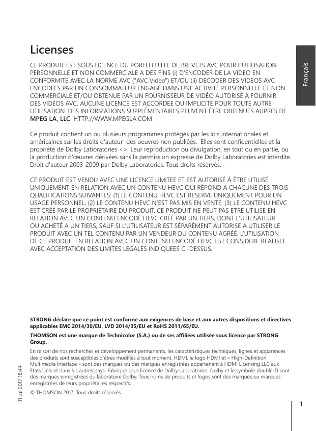 This product has been manufactured and sold under the responsibility of STRONG Group. THOMSON and the THOMSON logo are trademarks of Technicolor (S.A.) or its affiliates and are used under license by STRONG Group. Represented by STRONG Ges.m.b.H. Franz-Josefs-Kai 1 1010 Vienna, Austria E-Mail: support_at@thomsonstb.net Any other product, service, company, trade name and logo referenced herein are neither endorsed nor sponsored by Technicolor (S.A.) or its affiliates. 14 Jul 2017 13:11 CE PRODUIT EST SOUS LICENCE DU PORTEFEUILLE DE BREVETS AVC POUR L’UTILISATION PERSONNELLE ET NON COMMERCIALE A DES FINS (i) D‘ENCODER DE LA VIDEO EN CONFORMITÉ AVEC LA NORME AVC ("AVC Video") ET/OU (ii) DECODER DES VIDEOS AVC ENCODEES PAR UN CONSOMMATEUR ENGAGÉ DANS UNE ACTIVITÉ PERSONNELLE ET NON COMMERCIALE ET/OU OBTENUE PAR UN FOURNISSEUR DE VIDÉO AUTORISÉ À FOURNIR DES VIDÉOS AVC. AUCUNE LICENCE EST ACCORDEE OU IMPLICITE POUR TOUTE AUTRE UTILISATION. DES INFORMATIONS SUPPLÉMENTAIRES PEUVENT ÊTRE OBTENUES AUPRES DE MPEG LA, LLC HTTP://WWW.MPEGLA.COM Français Licenses Ce produit contient un ou plusieurs programmes protégés par les lois internationales et américaines sur les droits d'auteur des oeuvres non publiées. Elles sont confidentielles et la propriété de Dolby Laboratories <>. Leur reproduction ou divulgation, en tout ou en partie, ou la production d'œuvres dérivées sans la permission expresse de Dolby Laboratories est interdite. Droit d'auteur 2003-2009 par Dolby Laboratories. Tous droits réservés. CE PRODUIT EST VENDU AVEC UNE LICENCE LIMITEE ET EST AUTORISÉ À ÊTRE UTILISÉ UNIQUEMENT EN RELATION AVEC UN CONTENU HEVC QUI RÉPOND A CHACUNE DES TROIS QUALIFICATIONS SUIVANTES: (1) LE CONTENU HEVC EST RESERVE UNIQUEMENT POUR UN USAGE PERSONNEL; (2) LE CONTENU HEVC N’EST PAS MIS EN VENTE; (3) LE CONTENU HEVC EST CRÉÉ PAR LE PROPRIÉTAIRE DU PRODUIT. CE PRODUIT NE PEUT PAS ETRE UTILISE EN RELATION AVEC UN CONTENU ENCODÉ HEVC CRÉÉ PAR UN TIERS, DONT L'UTILISATEUR OU ACHETÉ A UN TIERS, SAUF SI L'UTILISATEUR EST SÉPARÉMENT AUTORISE A UTILISER LE PRODUIT AVEC UN TEL CONTENU PAR UN VENDEUR DU CONTENU AGRÉÉ. L’UTILISATION DE CE PRODUIT EN RELATION AVEC UN CONTENU ENCODÉ HEVC EST CONSIDERE REALISEE AVEC ACCEPTATION DES LIMITES LEGALES INDIQUEES CI-DESSUS. STRONG déclare que ce point est conforme aux exigences de base et aux autres dispositions et directives applicables EMC 2014/30/EU, LVD 2014/35/EU et RoHS 2011/65/EU. 11 Jul 2017 18:44 THOMSON est une marque de Technicolor (S.A.) ou de ses affiliées utilisée sous licence par STRONG Group. En raison de nos recherches et développement permanents, les caractéristiques techniques, lignes et apparences des produits sont susceptibles d’êtres modifiés à tout moment. HDMI, le logo HDMI et « High-Definition Multimedia Interface » sont des marques ou des marques enregistrées appartenant à HDMI Licensing LLC aux Etats Unis et dans les autres pays. Fabriqué sous licence de Dolby Laboratories. Dolby et le symbole double-D sont des marques enregistrées du laboratoire Dolby. Tous noms de produits et logos sont des marques ou marques enregistrées de leurs propriétaires respectifs. © THOMSON 2017. Tous droits réservés.