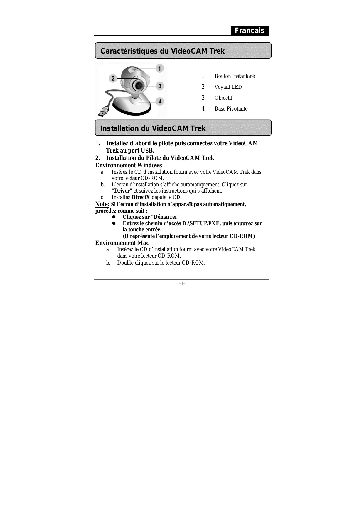 Insérez le CD d’installation fourni avec votre VideoCAM Trek dans votre lecteur CD-ROM. b. L’écran d’installation s’affiche automatiquement. Cliquez sur “Driver” et suivez les instructions qui s’affichent. c. Installez DirectX depuis le CD. Note: Si l’écran d’installation n’apparaît pas automatiquement, procédez comme suit : z Cliquez sur “Démarrer” z Entrez le chemin d’accès D:\SETUP.EXE, puis appuyez sur la touche entrée. (D représente l’emplacement de votre lecteur CD-ROM) Environnement Mac