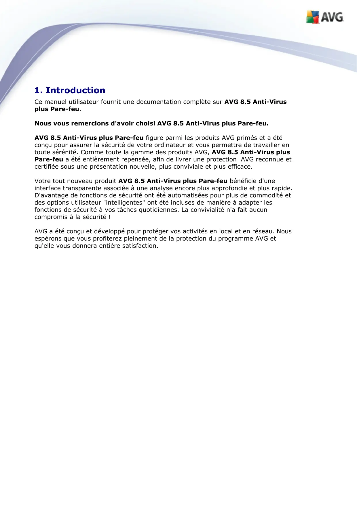 Ce manuel utilisateur fournit une documentation complète sur AVG 8.5 Anti-Virus plus Pare-feu. Nous vous remercions d'avoir choisi AVG 8.5 Anti-Virus plus Pare-feu. AVG 8.5 Anti-Virus plus Pare-feu figure parmi les produits AVG primés et a été conçu pour assurer la sécurité de votre ordinateur et vous permettre de travailler en toute sérénité. Comme toute la gamme des produits AVG, AVG 8.5 Anti-Virus plus Pare-feu a été entièrement repensée, afin de livrer une protection AVG reconnue et certifiée sous une présentation nouvelle, plus conviviale et plus efficace. Votre tout nouveau produit AVG 8.5 Anti-Virus plus Pare-feu bénéficie d'une interface transparente associée à une analyse encore plus approfondie et plus rapide. D'avantage de fonctions de sécurité ont été automatisées pour plus de commodité et des options utilisateur "intelligentes" ont été incluses de manière à adapter les fonctions de sécurité à vos tâches quotidiennes. La convivialité n'a fait aucun compromis à la sécurité ! AVG a été conçu et développé pour protéger vos activités en local et en réseau. Nous espérons que vous profiterez pleinement de la protection du programme AVG et qu'elle vous donnera entière satisfaction.