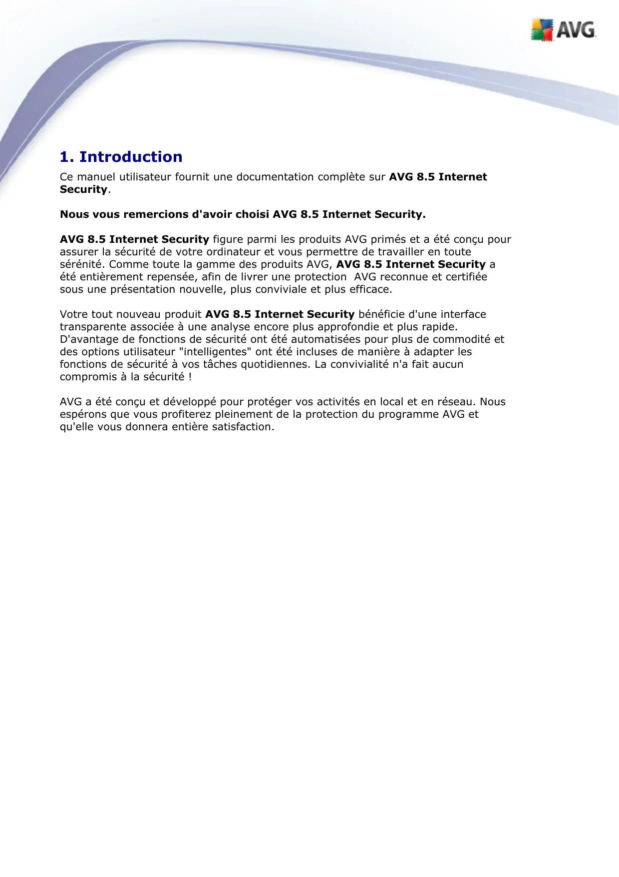 Ce manuel utilisateur fournit une documentation complète sur AVG 8.5 Internet Security. Nous vous remercions d'avoir choisi AVG 8.5 Internet Security. AVG 8.5 Internet Security figure parmi les produits AVG primés et a été conçu pour assurer la sécurité de votre ordinateur et vous permettre de travailler en toute sérénité. Comme toute la gamme des produits AVG, AVG 8.5 Internet Security a été entièrement repensée, afin de livrer une protection AVG reconnue et certifiée sous une présentation nouvelle, plus conviviale et plus efficace. Votre tout nouveau produit AVG 8.5 Internet Security bénéficie d'une interface transparente associée à une analyse encore plus approfondie et plus rapide. D'avantage de fonctions de sécurité ont été automatisées pour plus de commodité et des options utilisateur "intelligentes" ont été incluses de manière à adapter les fonctions de sécurité à vos tâches quotidiennes. La convivialité n'a fait aucun compromis à la sécurité ! AVG a été conçu et développé pour protéger vos activités en local et en réseau. Nous espérons que vous profiterez pleinement de la protection du programme AVG et qu'elle vous donnera entière satisfaction.