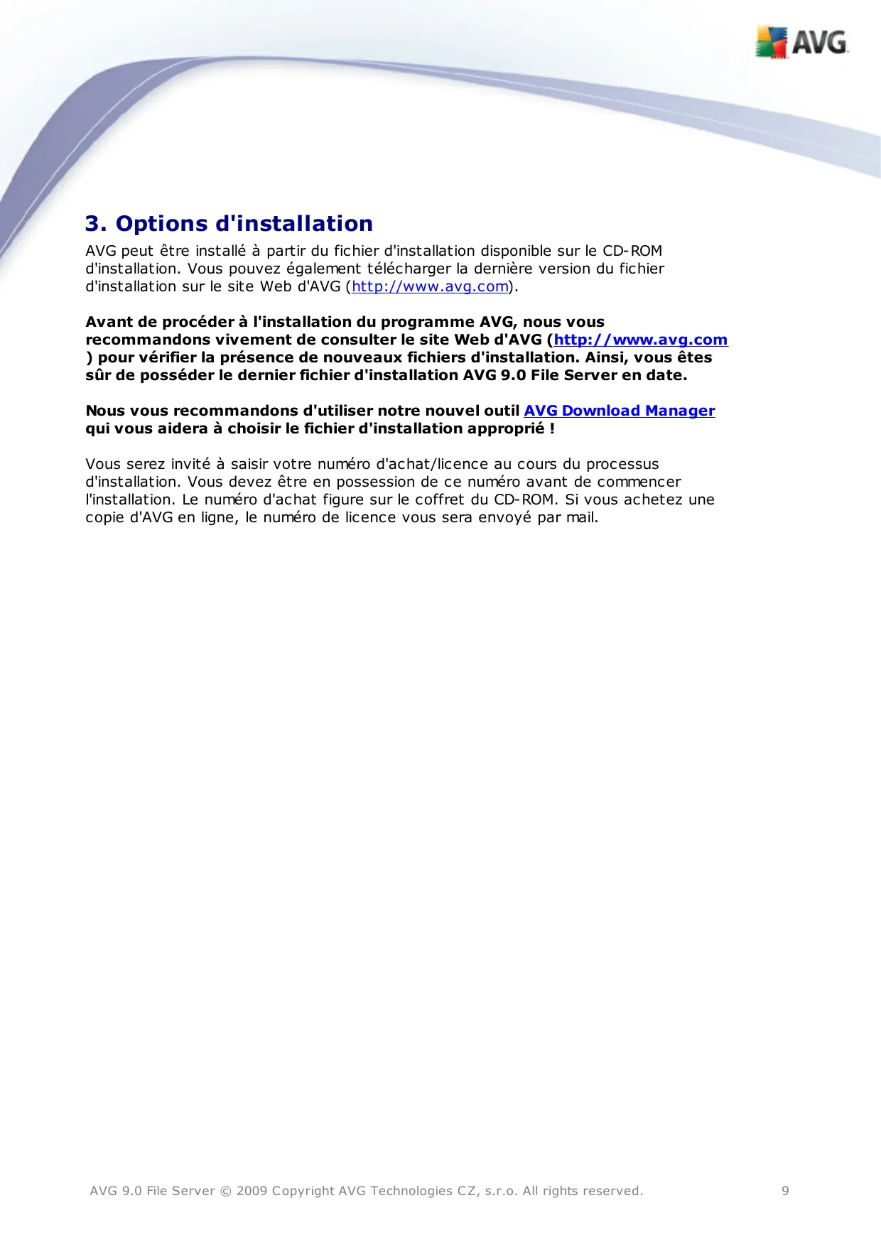 - 600 Mo d'espace disque dur (pour l'installation) AVG 9.0 File Server © 2009 C opyright AVG Technologies C Z, s.r.o. All rights reserved.