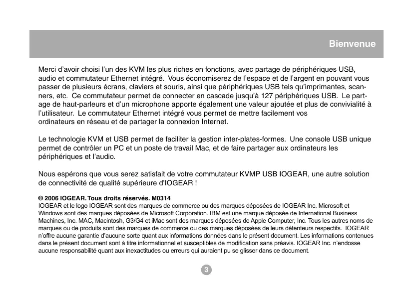 Commutateur KVM multi-fonctions deux ports USB 2.0 Manuel de l’utilisateur (GCS1772/GCS1774) Bienvenue Merci d’avoir choisi l’un des KVM les plus riches en fonctions, avec partage de périphériques USB, audio et commutateur Ethernet intégré. Vous économiserez de l’espace et de l’argent en pouvant vous passer de plusieurs écrans, claviers et souris, ainsi que périphériques USB tels qu’imprimantes, scanners, etc. Ce commutateur permet de connecter en cascade jusqu’à 127 périphériques USB. Le partage de haut-parleurs et d’un microphone apporte également une valeur ajoutée et plus de convivialité à l’utilisateur. Le commutateur Ethernet intégré vous permet de mettre facilement vos ordinateurs en réseau et de partager la connexion Internet. Le technologie KVM et USB permet de faciliter la gestion inter-plates-formes. Une console USB unique permet de contrôler un PC et un poste de travail Mac, et de faire partager aux ordinateurs les périphériques et l’audio. Nous espérons que vous serez satisfait de votre commutateur KVMP USB IOGEAR, une autre solution de connectivité de qualité supérieure d’IOGEAR ! © 2006 IOGEAR. Tous droits réservés. M0314 IOGEAR et le logo IOGEAR sont des marques de commerce ou des marques déposées de IOGEAR Inc. Microsoft et Windows sont des marques déposées de Microsoft Corporation. IBM est une marque déposée de International Business Machines, Inc. MAC, Macintosh, G3/G4 et iMac sont des marques déposées de Apple Computer, Inc. Tous les autres noms de marques ou de produits sont des marques de commerce ou des marques déposées de leurs détenteurs respectifs. IOGEAR n’offre aucune garantie d’aucune sorte quant aux informations données dans le présent document. Les informations contenues dans le présent document sont à titre informationnel et susceptibles de modification sans préavis. IOGEAR Inc. n’endosse aucune responsabilité quant aux inexactitudes ou erreurs qui auraient pu se glisser dans ce document.