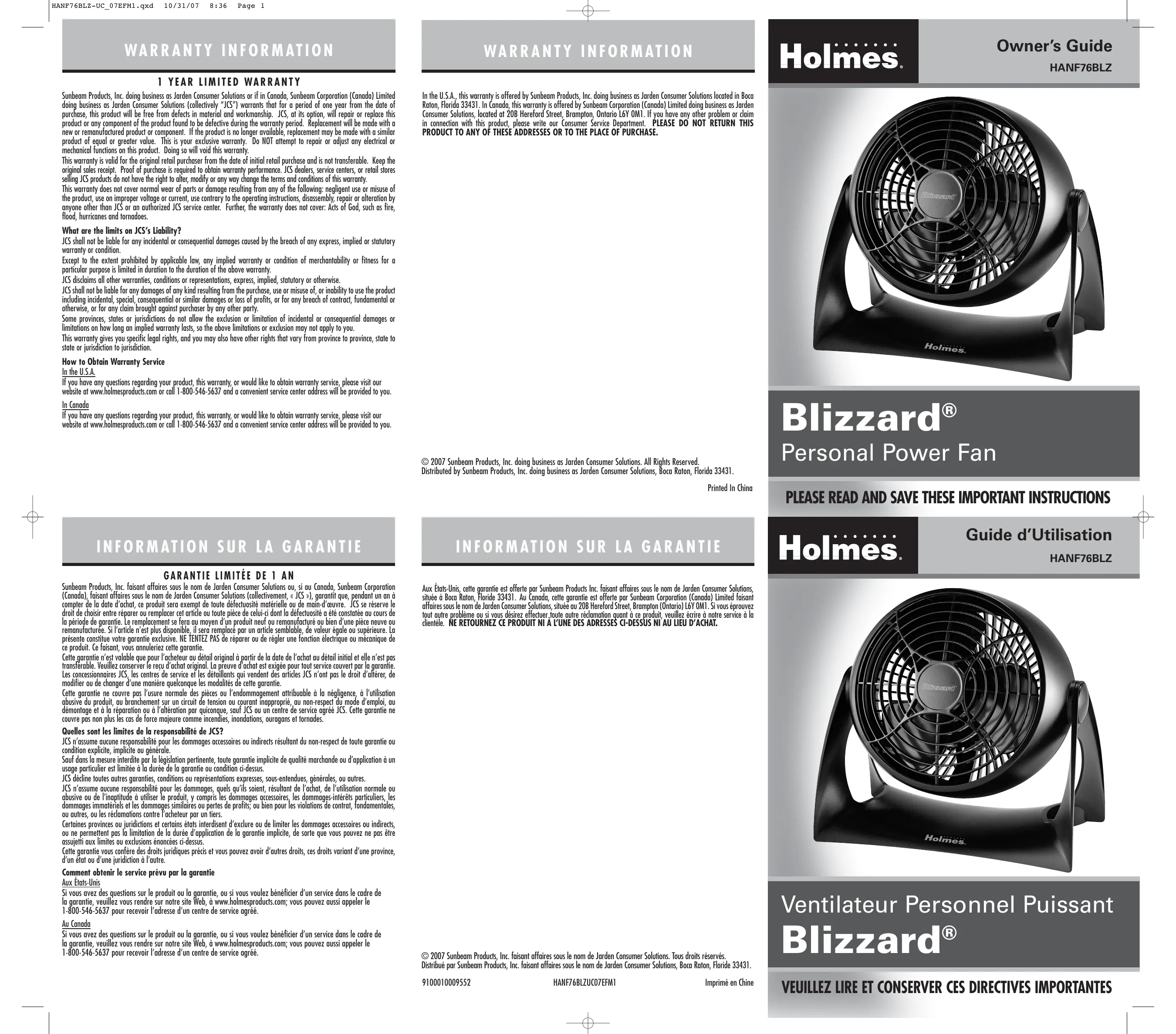 © 2007 Sunbeam Products, Inc. faisant affaires sous le nom de Jarden Consumer Solutions. Tous droits réservés. Distribué par Sunbeam Products, Inc. faisant affaires sous le nom de Jarden Consumer Solutions, Boca Raton, Florida 33431.