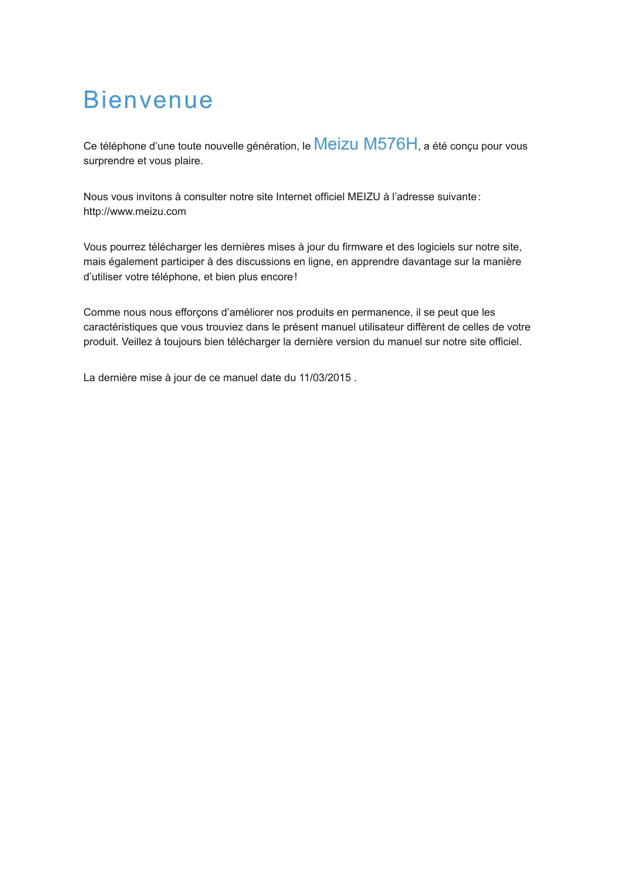 Bienvenue Ce téléphone d’une toute nouvelle génération, le Meizu M576H, a été conçu pour vous surprendre et vous plaire. Nous vous invitons à consulter notre site Internet officiel MEIZU à l'adresse suivante : http://www.meizu.com Vous pourrez télécharger les dernières mises à jour du firmware et des logiciels sur notre site, mais également participer à des discussions en ligne, en apprendre davantage sur la manière d'utiliser votre téléphone, et bien plus encore! Comme nous nous efforçons d'améliorer nos produits en permanence, il se peut que les caractéristiques que vous trouviez dans le présent manuel utilisateur diffèrent de celles de votre produit. Veillez à toujours bien télécharger la dernière version du manuel sur notre site officiel. La dernière mise à jour de ce manuel date du 11/03/2015.