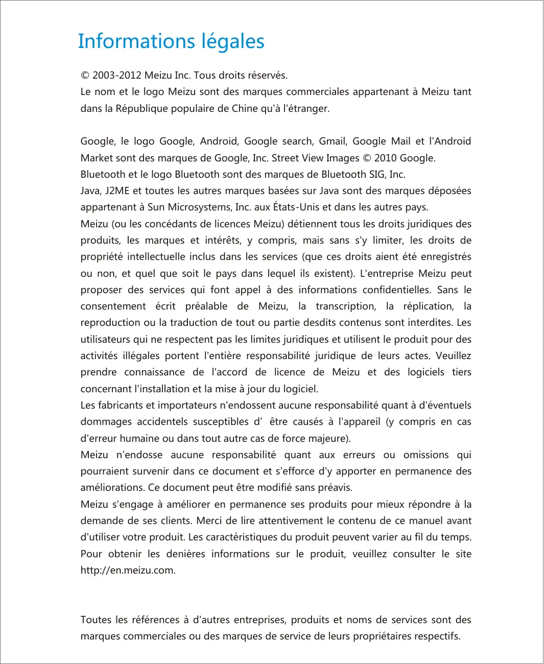 Informations légales © 2003-2012 Meizu Inc. Tous droits réservés. Le nom et le logo Meizu sont des marques commerciales appartenant à Meizu tant dans la République populaire de Chine qu'à l'étranger. Google, le logo Google, Android, Google search, Gmail, Google Mail et l'Android Market sont des marques de Googjle, Inc. Street View Images © 2010 Google. Bluetooth et le logo Bluetooth sont des marques de Bluetooth SIG, Inc. Java, J2ME et toutes les autres marques basées sur Java sont des marques déposées appartenant à Sun Microsystems, Inc. aux États-Unis et dans les autres pays. Meizu (ou les concédants de licences Meizu) détiennent tous les droits juridiques des produits, les marques et intérêts, y compris, mais sans s'y limiter, les droits de propriété intellectuelle inclus dans les services (que ces droits aient été enregistrés ou non, et quel que soit le pays dans lequel ils existent). L'entreprise Meizu peut proposer des services qui font appel à des informations confidentielles. Sans le consentement écrit préalable de Meizu, la transcription, la réplication, la reproduction ou la traduction de tout ou partie desdits contenus sont interdites. Les utilisateurs qui ne respectent pas les limites juridiques et utilisent le produit pour des activités illégales portent l'entière responsabilité juridique de leurs actes. Veuillez prendre connaissance de l'accord de licence de Meizu et des logiciels tiers concernant l'installation et la mise à jour du logiciel. Les fabricants et importateurs n'endossent aucune responsabilité quant à d'éventuels dommages accidentels susceptibles d' être causés à l'appareil (y compris en cas d'erreur humaine ou dans tout autre cas de force majeure). Meizu n'endosse aucune responsabilité quant aux erreurs ou omissions qui pourraient survenir dans ce document et s'efforce d'y apporter en permanence des améliorations. Ce document peut être modifié sans préavis. Meizu s'engage à améliorer en permanence ses produits pour mieux répondre à la demande de ses clients. Merci de lire attentivement le contenu de ce manuel avant d'utiliser votre produit. Les caractéristiques du produit peuvent varier au fil du temps. Pour obtenir les denières informations sur le produit, veuillez consulter le site http://en.meizu.com. Toutes les références à d'autres entreprises, produits et noms de services sont des marques commerciales ou des marques de service de leurs propriétaires respectifs.