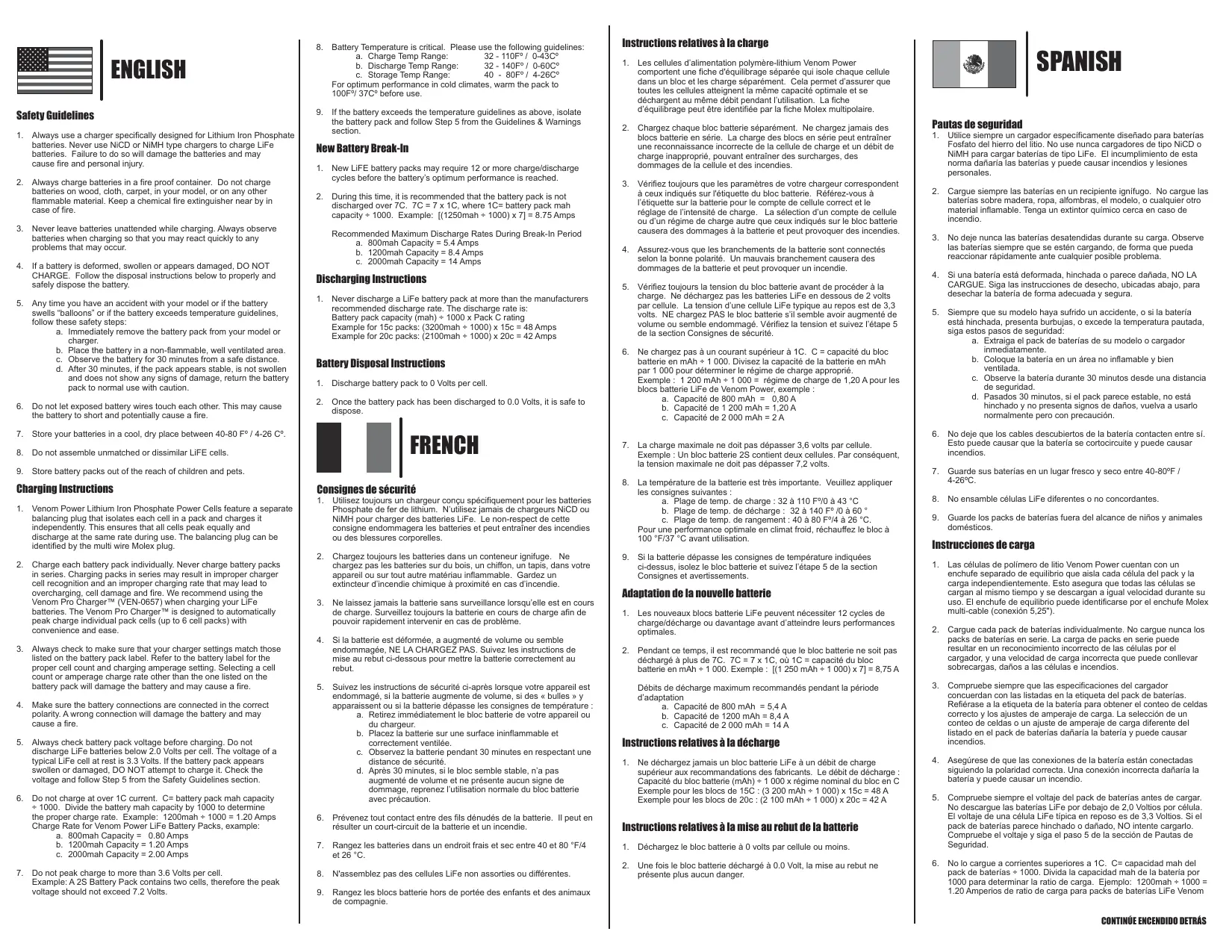 - Ne chargez pas à un courant supérieur à 1C. C = capacité du bloc batterie en mAh ÷ 1 000. Divisez la capacité de la batterie en mAh par 1 000 pour déterminer le régime de charge approprié. Exemple: 1 200 mAh ÷ 1 000 = régime de charge de 1,20 A pour les blocs batterie LiFe de Venom Power, exemple :