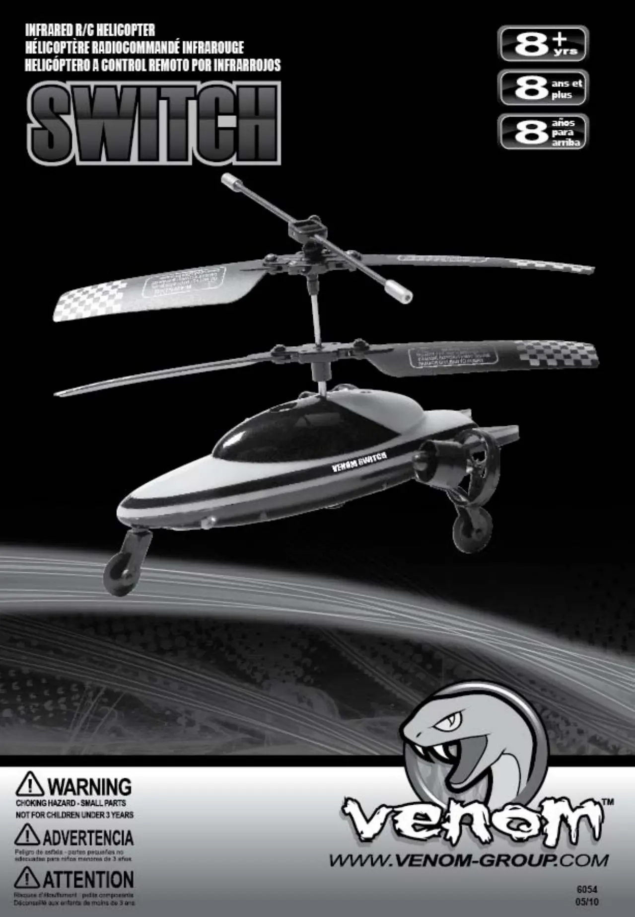 -Ne tentez de modifier cet appareil d'aucune manière que ce soit. - Maintenez les pièces mobiles à l'écart des cheveux, des vêtements et des mains. - Maintenez l'appareil à l'écart des animaux et des jeunes enfants. N'oubliez jamais de positionner l'appareil sur OFF lorsqu'il est en cours de charge. Lorsque vous faites voler l'hélicoptère à finièreur, assurez-vous de disposer d'une zone libre de 6 mètres (largeur) x 9 mètres (longueur) x 3 mètres (hauteur). - Maintenez l'appareil à l'écart des objets suivants: ventilateurs électriques et de plafond, climatiseurs, lampes de lecture et/ou autres objets dangereux. - Ne couvrez pas le récepteur de l'hélicoptère avec un ruban adhésif ou des autocollants. Cela peut interrompre le signal. Lorsque vous faites voler l'hélicoptère à l'extérieur, assurez-vous que les conditions météorologiques y sont propices. Pendant l'utilisation à l'extérieur, faites également attention à la circulation aux lignes électriques aériennes et/ou aux autres objets dangereux. - Ne plongez pas cet appareil dans l'eau. Cela pourrait endommager ses composants électroniques. - Ne volez pas sous la lumière du soleil directe comme ceci peut générer le signal d'émetteur. La pile dans le Switch Venom n'est PAS remplacable.