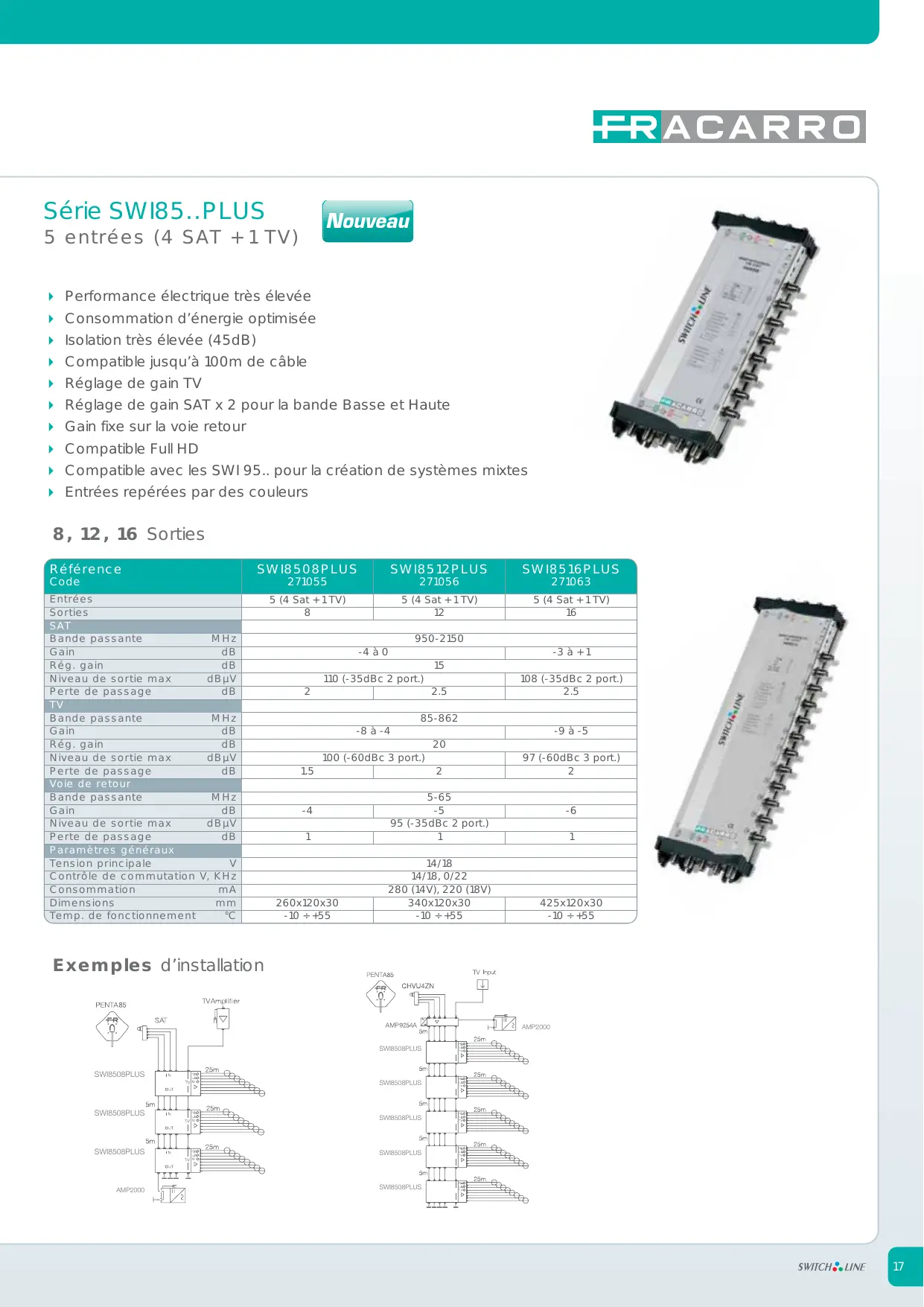 Série SWI317..S 17 entrées (16 SAT + 1 TV) Isolation très élevée (45dB) Passage de la voie retour Compatible Full HD Bande passante jusqu'à 2300 MHz Entrées repérées par des couleurs 6, 12, 16 Sorties Référence SWI31706S SWI31712S