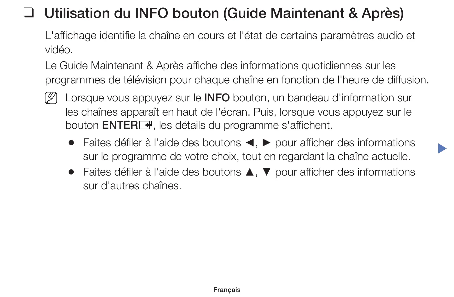 ❑❑ Utilisation du INFO bouton (Guide Maintenant & Après) L'affichage identifie la chaîne en cours et l'état de certains paramètres audio et vidéo. Le Guide Maintenant & Après affiche des informations quotidiennes sur les programmes de télévision pour chaque chaîne en fonction de l'heure de diffusion. NN Lorsque vous appuyez sur le INFO bouton, un bandeau d'information sur les chaînes apparaît en haut de l'écran. Puis, lorsque vous appuyez sur le bouton ENTERE, les détails du programme s'affichent. ●● Faites défiler à l'aide des boutons ◄, ► pour afficher des informations sur le programme de votre choix, tout en regardant la chaîne actuelle. ●● Faites défiler à l'aide des boutons ▲, ▼ pour afficher des informations sur d'autres chaînes. Français