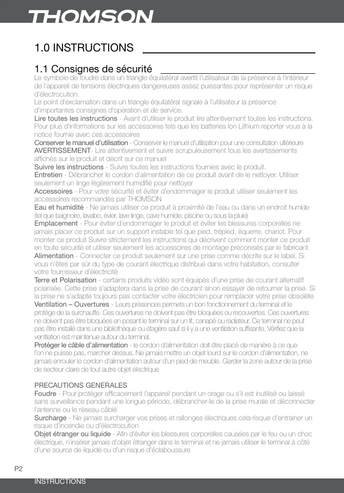Le symbole de foudre dans un triangle équilatéral avertit l’utilisateur de la présence à l’intérieur de l’appareil de tensions électriques dangereuses assez puissantes pour représenter un risque d’électrocution. Le point d’exclamation dans un triangle équilatéral signale à l’utilisateur la présence d’importantes consignes d’opération et de service. Lire toutes les instructions - Avant d’utiliser le produit lire attentivement toutes les instructions. Pour plus d’informations sur les accessoires tels que les batteries Ion Lithium reporter vous à la notice fournie avec ces accessoires Conserver le manuel d’utilisation - Conserver le manuel d’utilisation pour une consultation ultérieure AVERTISSEMENT- Lire attentivement et suivre scrupuleusement tous les avertissements affichés sur le produit et décrit sur ce manuel Suivre les instructions - Suivre toutes les instructions fournies avec le produit. Entretien - Débrancher le cordon d’alimentation de ce produit avant de le nettoyer. Utiliser seulement un linge légèrement humidifié pour nettoyer Accessoires - Pour votre sécurité et éviter d’endommager le produit utiliser seulement les accessoires recommandés par THOMSON Eau et humidité - Ne jamais utiliser ce produit à proximité de l’eau ou dans un endroit humide (tel que baignoire, lavabo, évier, lave linge, cave humide, piscine ou sous la pluie) Emplacement - Pour éviter d’endommager le produit et éviter les blessures corporelles ne jamais placer ce produit sur un support instable tel que pied, trépied, équerre, chariot. Pour monter ce produit Suivre strictement les instructions qui décrivent comment monter ce produit en toute sécurité et utiliser seulement les accessoires de montage préconisés par le fabricant Alimentation - Connecter ce produit seulement sur une prise comme décrite sur le label. Si vous n’êtes par sûr du type de courant électrique distribué dans votre habitation, consulter votre fournisseur d’électricité Terre et Polarisation - certains produits vidéo sont équipés d’une prise de courant alternatif polarisée. Cette prise s’adaptera dans la prise de courant sinon essayer de retourner la prise. Si la prise ne s’adapte toujours pas contacter votre électricien pour remplacer votre prise obsolète Ventilation – Ouvertures - Leurs présences permets un bon fonctionnement du terminal et le protège de la surchauffe. Ces ouvertures ne doivent pas être bloquées ou recouvertes. Ces ouvertures ne doivent pas être bloquées en posant le terminal sur un lit, canapé ou radiateur. Ce terminal ne peut pas être installé dans une bibliothèque ou étagère sauf si il y a une ventilation suffisante. Vérifiez que la ventilation est maintenue autour du terminal. Protéger le câble d’alimentation - le cordon d’alimentation doit être placé de manière à ce que l’on ne puisse pas, marcher dessus. Ne jamais mettre un objet lourd sur le cordon d’alimentation, ne jamais enrouler le cordon d’alimentation autour d’un pied de meuble. Garder la zone autour de la prise de secteur claire de tout autre objet électrique PRECAUTIONS GENERALES Foudre - Pour protéger efficacement l’appareil pendant un orage ou s’il est inutilisé ou laissé sans surveillance pendant une longue période, débrancher-le de la prise murale et déconnecter l’antenne ou le réseau câblé Surcharge - Ne jamais surcharger vos prises et rallonges électriques cela risque d’entrainer un risque d’incendie ou d’électrocution Objet étranger ou liquide - Afin d’éviter les blessures corporelles causées par le feu ou un choc électrique, n’insérer jamais d’objet étranger dans le terminal et ne jamais utiliser le terminal à côté d’une source de liquide ou d’un risque d’éclaboussure INSTRUCTIONS Français Chaleur - Ne jamais utiliser ou stocker ce terminal près d’une source de chaleur même un amplificateur audio Maintenance - contacter un professionnel, ne pas ouvrir le capot au risque de s’exposer à de hautes tensions Situations requérant une maintenance - Débrancher le terminal du secteur et contacter un professionnel dans les cas suivants: