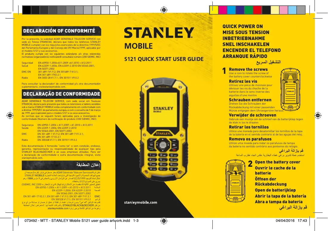 Par la presente, la société ADAR GENERALE TELECOM SERVICE située à Toulouse (FRANCE), déclare que tous les mobiles & tablettes STANLEY MOBILE sont conformes aux exigencies essentielles de la directive 1999/5/EC du Parlement Européen et du Conseil du 09/Mars/1999, applicable pour le modele $121 et ses accessories.