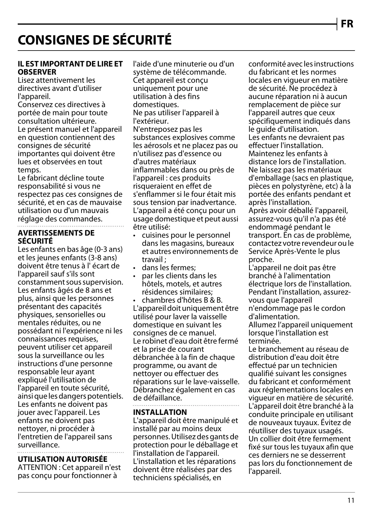 - chambres d'hôtes B & B. L'appareil doit uniquement être utilisé pour laver la vaisselle domestique en suivant les consignes de ce manuel. Le robinet d'eau doit être fermé et la prise de courant débranchée à la fin de chaque programme, ou avant de nettoyer ou effectuer des réparations sur le lave-vaisselle. Débranchez également en cas de défaillance. INSTALLATION L'appareil doit être manipulé et installé par au moins deux personnes. Utilisez des gants de protection pour le déballage et l'installation de l'appareil. L'installation et les réparations doivent être réalisées par des techniciens spécialisés, en conformité avec les instructions du fabricant et les normes locales en vigueur en matière de sécurité. Ne procédez à aucune réparation ni à aucun remplacement de pièce sur l'appareil autres que ceux spécifiquement indiqués dans le guide d'utilisation. Les enfants ne devraient pas effectuer l'installation. Maintenez les enfants à distance lors de l'installation. Ne laissez pas les matériaux d'emballage (sacs en plastique, pièces en polystyrène, etc) à la portée des enfants pendant et après l'installation. Après avoir déballé l'appareil, assurez-vous qu'il n'a pas été endommagé pendant le transport. En cas de problème, contactez votre revendeur ou le Service Après-Vente le plus proche. L'appareil ne doit pas être branché à l'alimentation électrique lors de l'installation. Pendant l'installation, assurezvous que l'appareil n'endommage pas le cordon d'alimentation. Allumez l’appareil uniquement lorsque l’installation est terminée. Le branchement au réseau de distribution d'eau doit être effectué par un technicien qualifié suivant les consignes du fabricant et conformément aux réglementations locales en vigueur en matière de sécurité. L'appareil doit être branché à la conduite principale en utilisant de nouveaux tuyaux. Évitez de réutiliser des tuyaux usagés. Un collier doit être fermement fixé sur tous les tuyaux afin que ces derniers ne se desserrent pas lors du fonctionnement de l'appareil.
