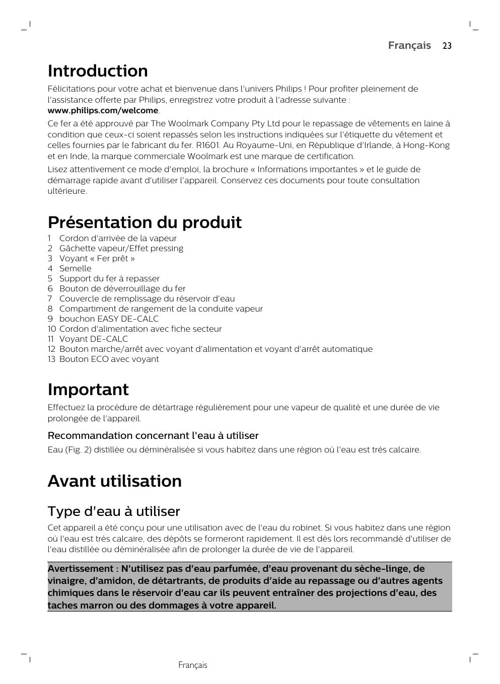 Introduction Félicitations pour votre achat et bienvenue dans l'univers Philips ! Pour profiter pleinement de l'assistance offerte par Philips, enregistrez votre produit à l'adresse suivante : www.philips.com/welcome. Ce fer a été approuvé par The Woolmark Company Pty Ltd pour le repassage de vêtements en laine à condition que ceux-ci soient repassés selon les instructions indiquées sur l'étiquette du vêtement et celles fournies par le fabricant du fer. R1601. Au Royaume-Uni, en République d'Irlande, à Hong-Kong et en Inde, la marque commerciale Woolmark est une marque de certification. Lisez attentivement ce mode d'emploi, la brochure « Informations importantes » et le guide de démarrage rapide avant d'utiliser l'appareil. Conservez ces documents pour toute consultation ultérieure.