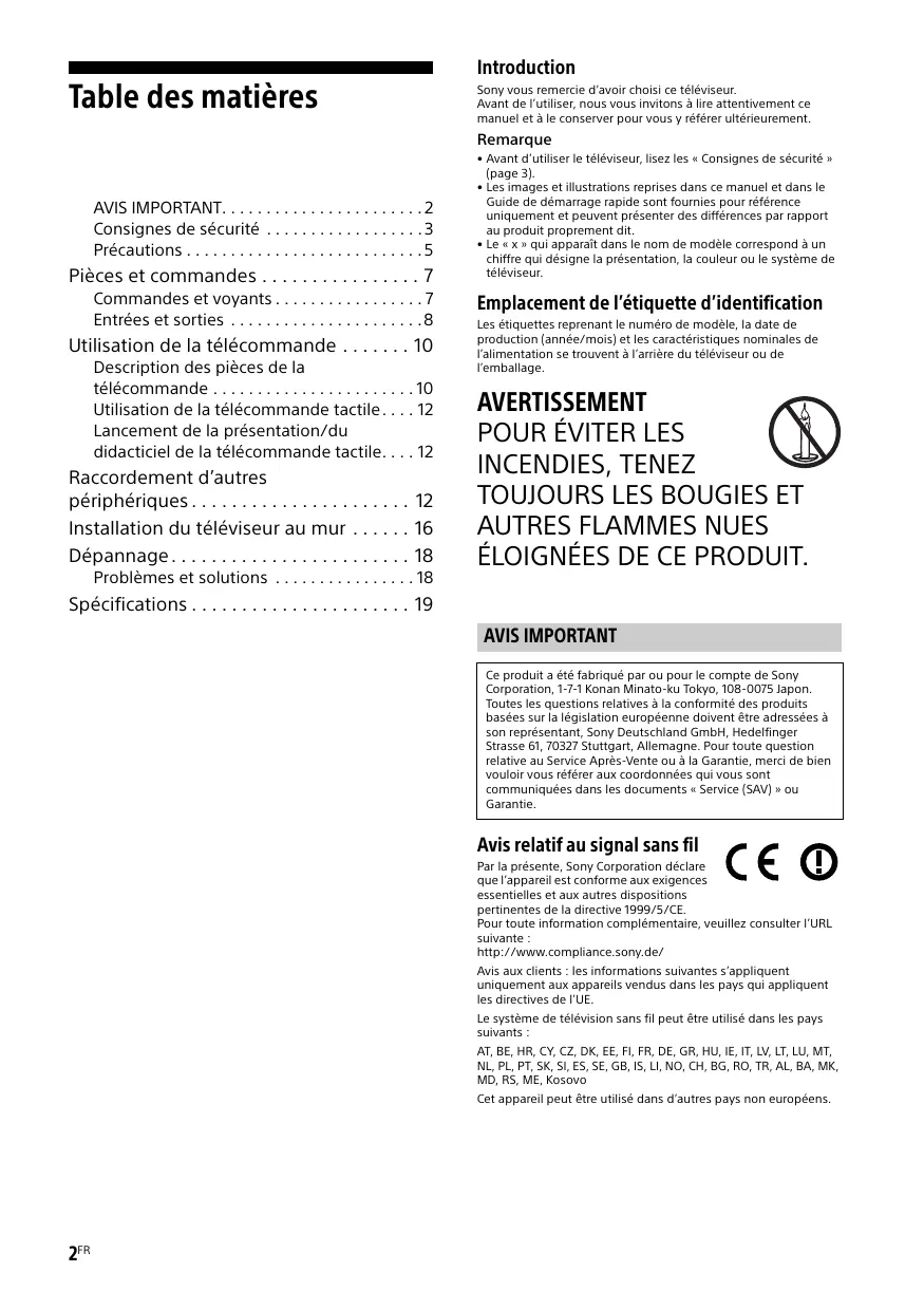 - The N Mark is a trademark or registered trademark of NFC Forum, Inc. in the United States and in other countries. Introduction Table des matières Sony vous remercie d’avoir choisi ce téléviseur. Avant de l’utiliser, nous vous invitons à lire attentivement ce manuel et à le conserver pour vous y référer ultérieurement. Remarque AVIS IMPORTANT. . . . . . . . . . . . . . . . . . . . . . . 2 Consignes de sécurité . . . . . . . . . . . . . . . . . . 3 Précautions . . . . . . . . . . . . . . . . . . . . . . . . . . . 5 Pièces et commandes . . . . . . . . . . . . . . . . 7 Commandes et voyants . . . . . . . . . . . . . . . . . 7 Entrées et sorties . . . . . . . . . . . . . . . . . . . . . . 8 Utilisation de la télécommande . . . . . . . 10 Description des pièces de la télécommande . . . . . . . . . . . . . . . . . . . . . . . 10 Utilisation de la télécommande tactile . . . . 12 Lancement de la présentation/du didacticiel de la télécommande tactile. . . . 12 Raccordement d’autres périphériques . . . . . . . . . . . . . . . . . . . . . . 12 Installation du téléviseur au mur . . . . . . 16 Dépannage . . . . . . . . . . . . . . . . . . . . . . . . 18