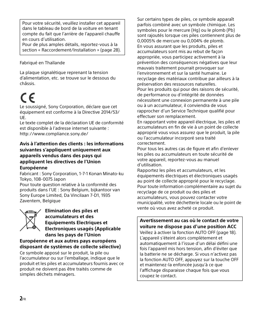 32DE Verriegelung Austauschen der Sicherung Wenn Sie eine Sicherung Sicherung (10 A) austauschen, achten Sie darauf, eine Ersatzsicherung mit dem gleichen Ampere-Wert wie die Originalsicherung zu verwenden. Dieser ist auf der Originalsicherung angegeben. Wenn die Sicherung durchbrennt, überprüfen Sie den Stromanschluss und tauschen die Sicherung aus. Brennt die neue Sicherung ebenfalls durch, kann eine interne Fehlfunktion vorliegen. Wenden Sie sich in einem solchen Fall an Ihren SonyHändler. Pour votre sécurité, veuillez installer cet appareil dans le tableau de bord de la voiture en tenant compte du fait que l’arrière de l’appareil chauffe en cours d’utilisation. Pour de plus amples détails, reportez-vous à la section « Raccordement/Installation » (page 28). Fabriqué en Thaïlande La plaque signalétique reprenant la tension d’alimentation, etc. se trouve sur le dessous du châssis. Le soussigné, Sony Corporation, déclare que cet équipement est conforme à la Directive 2014/53/ UE. Le texte complet de la déclaration UE de conformité est disponible à l’adresse internet suivante : http://www.compliance.sony.de/ Avis à l’attention des clients : les informations suivantes s’appliquent uniquement aux appareils vendus dans des pays qui appliquent les directives de l’Union Européenne Fabricant : Sony Corporation, 1-7-1 Konan Minato-ku Tokyo, 108-0075 Japon Pour toute question relative à la conformité des produits dans l’UE : Sony Belgium, bijkantoor van Sony Europe Limited, Da Vincilaan 7-D1, 1935 Zaventem, Belgique Elimination des piles et accumulateurs et des Equipements Electriques et Electroniques usagés (Applicable dans les pays de l’Union Européenne et aux autres pays européens disposant de systèmes de collecte sélective) Ce symbole apposé sur le produit, la pile ou l’accumulateur ou sur l’emballage, indique que le produit et les piles et accumulateurs fournis avec ce produit ne doivent pas être traités comme de simples déchets ménagers. 2FR Sur certains types de piles, ce symbole apparaît parfois combiné avec un symbole chimique. Les symboles pour le mercure (Hg) ou le plomb (Pb) sont rajoutés lorsque ces piles contiennent plus de 0,0005% de mercure ou 0,004% de plomb. En vous assurant que les produits, piles et accumulateurs sont mis au rebut de façon appropriée, vous participez activement à la prévention des conséquences négatives que leur mauvais traitement pourrait provoquer sur l’environnement et sur la santé humaine. Le recyclage des matériaux contribue par ailleurs à la préservation des ressources naturelles. Pour les produits qui pour des raisons de sécurité, de performance ou d’intégrité de données nécessitent une connexion permanente à une pile ou à un accumulateur, il conviendra de vous rapprocher d’un Service Technique qualifié pour effectuer son remplacement. En rapportant votre appareil électrique, les piles et accumulateurs en fin de vie à un point de collecte approprié vous vous assurez que le produit, la pile ou l’accumulateur incorporé sera traité correctement. Pour tous les autres cas de figure et afin d’enlever les piles ou accumulateurs en toute sécurité de votre appareil, reportez-vous au manuel d’utilisation. Rapportez les piles et accumulateurs, et les équipements électriques et électroniques usagés au point de collecte approprié pour le recyclage. Pour toute information complémentaire au sujet du recyclage de ce produit ou des piles et accumulateurs, vous pouvez contacter votre municipalité, votre déchetterie locale ou le point de vente où vous avez acheté ce produit. Avertissement au cas où le contact de votre voiture ne dispose pas d’une position ACC Veillez à activer la fonction AUTO OFF (page 18). L’appareil s’éteint alors complètement et automatiquement à l’issue d’un délai défini une fois l’appareil mis hors tension, afin d’éviter que la batterie ne se décharge. Si vous n’activez pas la fonction AUTO OFF, appuyez sur la touche OFF et maintenez-la enfoncée jusqu’à ce que l’affichage disparaisse chaque fois que vous coupez le contact. Avis d’exclusion de responsabilité relatif aux services proposés par des tiers Les services proposés par des tiers peuvent être modifiés, suspendus ou clôturés sans avis préalable. Sony n’assume aucune responsabilité dans ce genre de situation. Notification importante Attention SONY NE PEUT EN AUCUN CAS ETRE TENU
