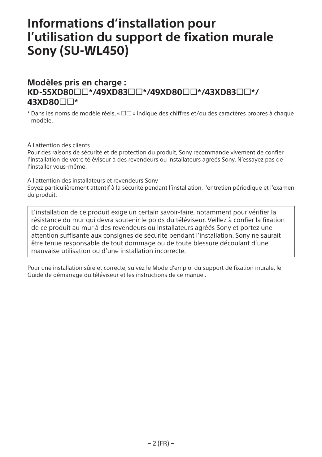 Informations d’installation pour l’utilisation du support de fixation murale Sony (SU-WL450) Modèles pris en charge : KD-55XD80*/49XD83*/49XD80*/43XD83*/ 43XD80* * Dans les noms de modèle réels, « » indique des chiffres et/ou des caractères propres à chaque modèle.