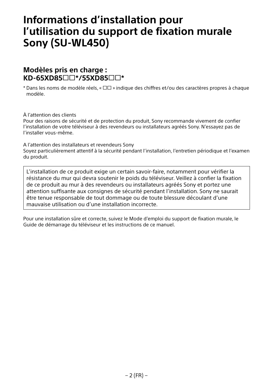 Informations d’installation pour l’utilisation du support de fixation murale Sony (SU-WL450) Modèles pris en charge : KD-65XD85*/55XD85* * Dans les noms de modèle réels, « » indique des chiffres et/ou des caractères propres à chaque modèle.