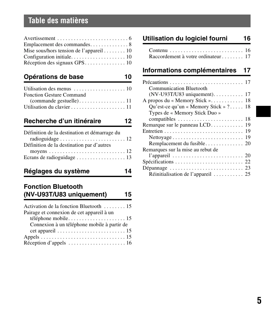 Précautions . . . . . . . . . . . . . . . . . . . . . . . . . . . Communication Bluetooth (NV-U93T/U83 uniquement). . . . . . . . . . . A propos du « Memory Stick ». . . . . . . . . . . . Qu’est-ce qu’un « Memory Stick » ? . . . . . Types de « Memory Stick Duo » compatibles . . . . . . . . . . . . . . . . . . . . . . . . Remarque sur le panneau LCD . . . . . . . . . . . . Entretien . . . . . . . . . . . . . . . . . . . . . . . . . . . . . Nettoyage . . . . . . . . . . . . . . . . . . . . . . . . . . Remplacement du fusible. . . . . . . . . . . . . . Remarques sur la mise au rebut de l’appareil . . . . . . . . . . . . . . . . . . . . . . . . . . Spécifications . . . . . . . . . . . . . . . . . . . . . . . . . Dépannage . . . . . . . . . . . . . . . . . . . . . . . . . . . Réinitialisation de l’appareil . . . . . . . . . . .