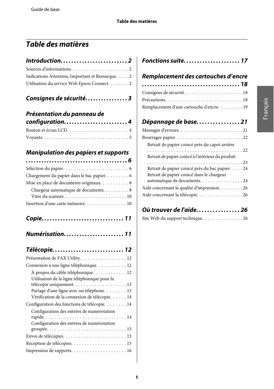Les versions les plus récentes des manuels suivants sont disponibles sur le site Web d'assistance Epson. http://www.epson.eu/Support (Europe) http://support.epson.net/ (hors Europe)
