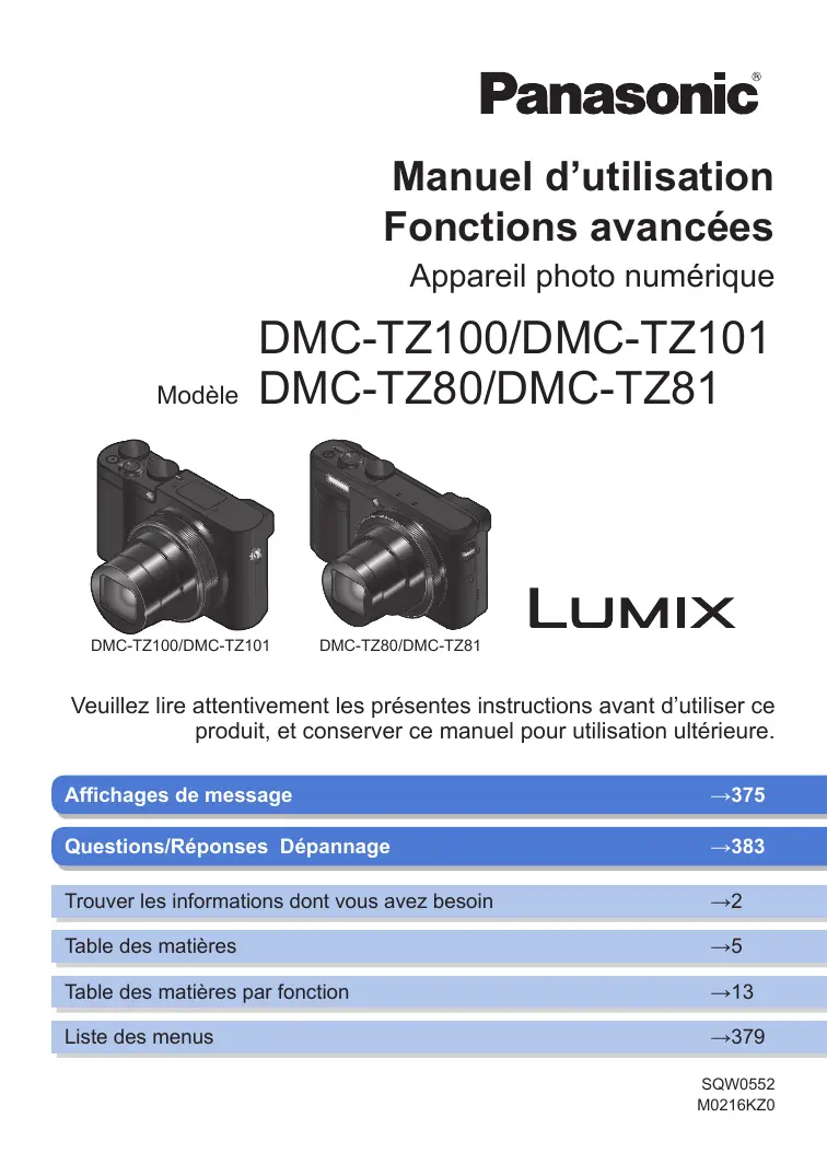 Manuel d’utilisation Fonctions avancées Appareil photo numérique Modèle DMC-TZ100/DMC-TZ101 DMC-TZ80/DMC-TZ81 DMC-TZ100/DMC-TZ101 DMC-TZ80/DMC-TZ81 Veuillez lire attentivement les présentes instructions avant d’utiliser ce produit, et conserver ce manuel pour utilisation ultérieure. Affichages de message