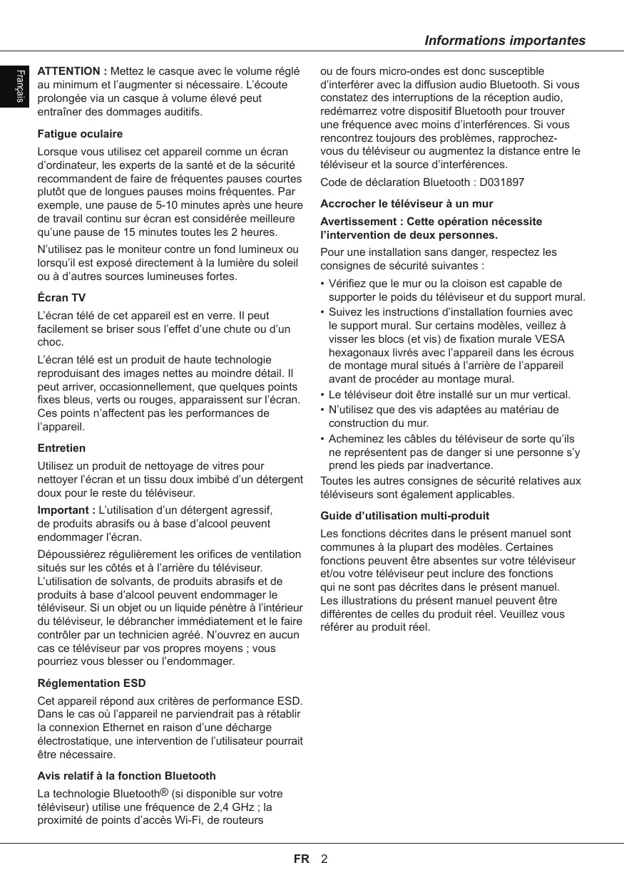 • En expliquant aux enfants qu’il est dangereux de tenter d’atteindre le téléviseur ou ses touches de commande en grimpant sur un meuble. Ces consignes doivent être respectées même avec un téléviseur existant. Un équipement portant ce symbole est un appareil de classe II ou doté d'une double isolation électrique. Il a été conçu de manière que sa mise à la terre pour la sécurité électrique n'est pas nécessaire. Un équipement ne portant pas ce symbole est un appareil électrique de classe I. L'appareil doit être branché dans une prise secteur disposant d'une mise à la terre. Débranchez immédiatement le téléviseur si vous constatez qu’il dégage une odeur de brûlé ou de la fumée. Vous ne devez en aucun cas ouvrir vousmême le téléviseur, vous risquez de recevoir une décharge électrique. AVERTISSEMENTS Cet appareil est destiné à un usage domestique en intérieur et ne doit pas être autrement utilisé comme, par exemple, pour un usage non domestique ou dans un environnement commercial. Si le câble extérieur souple ou le cordon de cet appareil est endommagé, il doit être remplacé par Afin d’éviter la propagation d’incendie, maintenez toujours bougies ou autres flammes nues éloignées de ce produit. Afin d’éviter toute blessure, cet appareil doit être solidement fixé au sol/mur selon les instructions d’installation. FR 1 Français Informations importantes Informations importantes Français ATTENTION : Mettez le casque avec le volume réglé au minimum et l’augmenter si nécessaire. L’écoute prolongée via un casque à volume élevé peut entraîner des dommages auditifs. Fatigue oculaire Lorsque vous utilisez cet appareil comme un écran d’ordinateur, les experts de la santé et de la sécurité recommandent de faire de fréquentes pauses courtes plutôt que de longues pauses moins fréquentes. Par exemple, une pause de 5-10 minutes après une heure de travail continu sur écran est considérée meilleure qu’une pause de 15 minutes toutes les 2 heures. N’utilisez pas le moniteur contre un fond lumineux ou lorsqu’il est exposé directement à la lumière du soleil ou à d’autres sources lumineuses fortes. Écran TV L’écran télé de cet appareil est en verre. Il peut facilement se briser sous l’effet d’une chute ou d’un choc. L’écran télé est un produit de haute technologie reproduisant des images nettes au moindre détail. Il peut arriver, occasionnellement, que quelques points fixes bleus, verts ou rouges, apparaissent sur l’écran. Ces points n’affectent pas les performances de l’appareil. Entretien Utilisez un produit de nettoyage de vitres pour nettoyer l’écran et un tissu doux imbibé d’un détergent doux pour le reste du téléviseur. Important : L’utilisation d’un détergent agressif, de produits abrasifs ou à base d’alcool peuvent endommager l’écran. ou de fours micro-ondes est donc susceptible d’interférer avec la diffusion audio Bluetooth. Si vous constatez des interruptions de la réception audio, redémarrez votre dispositif Bluetooth pour trouver une fréquence avec moins d’interférences. Si vous rencontrez toujours des problèmes, rapprochezvous du téléviseur ou augmentez la distance entre le téléviseur et la source d’interférences. Code de déclaration Bluetooth : D031897 Accrocher le téléviseur à un mur