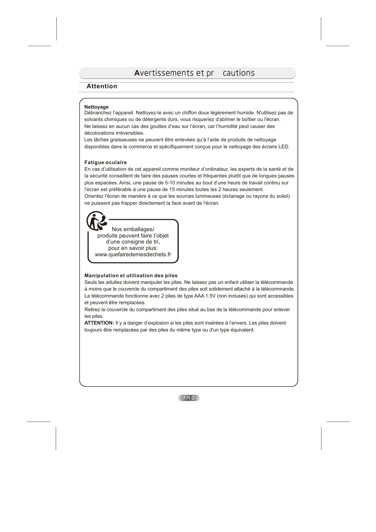 - SPÉCIFICATIONS Avertissementsetpr cautions Attention Alimentation Ce téléviseur est conçu pour être alimenté par une prise de courant alternatif de 100-240V~ 50/60Hz. Toute autre source d’alimentation est susceptible de l’endommager. Avant de le brancher pour la première fois, vérifiez que la plaque signalétique (située derrière) indique bien AC 100-240V. Le fabricant ne saurait être tenu responsable des dommages corporels ou matériels résultant du branchement de l’appareil sur une prise dont la tension est inadéquate. Cet appareil contient des pièces sous haute tension pouvant représenter un risque d’électrocution. Cet appareil est équipé d’une double isolation; il n’est donc pas indispensable de le relier à la terre. Ce symbole indique que l’appareil est conforme aux normes européennes de sécurité et de compatibilité électromagnétique. A La documentation accompagnant cet appareil contient d’importantes instructions d’utilisation et d’entretien. Utilisation et entretien du téléviseur en toute sécurité Ce téléviseur a été conçu et fabriqué conformément aux normes européennes de sécurité ; néanmoins, comme pour tout appareil électrique, il est indispensable d’en prendre soin afin de garantir une utilisation optimale et sans danger. Suivez les recommandations ci-dessous. Lisez attentivement le mode d’emploi avant d’utiliser le téléviseur pour la première fois. Prenez soin du câble. Faites en sorte qu’il ne risque pas d’être piétiné, écrasé, coupé, déchiré ou coincé. Coupez l’alimentation ou débranchez le téléviseur avant de le laisser sans surveillance sauf si son fonctionnement nécessite qu’il reste sous tension en. Évitez d’utiliser l’appareil dans un environnement difficile (pièces humides, mouillées ou très poussiéreuses, air très humide, fortes vibrations, températures très élevées ou très basses, emplacement trop ensoleillé). N'essayez en aucun cas de monter le téléviseur sur un support ou socle improvisé. Aucun objet ne doit être introduit dans les trous et les orifices de ventilation. Afin d'éviter tout risque de choc électrique, n'enlevez aucun panneau de l'appareil. L'écran LED chauffe lorsque l'appareil est allumé, ce phénomène est normal et n'indique pas un dysfonctionnement; ne touchez pas l'écran. En cas de panne, n’essayez pas de réparer l’appareil par vous-même : faites examiner l’appareil par un réparateur qualifié. Eteignez le téléviseur et débranchez le câble d'alimentation de la prise secteur pendant les orages. FR-1 Avertissementsetpr cautions Attention Nettoyage Débranchez l’appareil. Nettoyez-le avec un chiffon doux légèrement humide. N'utilisez pas de solvants chimiques ou de détergents durs, vous risqueriez d'abîmer le boîtier ou l'écran. Ne laissez en aucun cas des gouttes d’eau sur l’écran, car l’humidité peut causer des décolorations irréversibles. Les tâches graisseuses ne peuvent être enlevées qu’à l’aide de produits de nettoyage disponibles dans le commerce et spécifiquement conçus pour le nettoyage des écrans LED. Fatigue oculaire En cas d’utilisation de cet appareil comme moniteur d’ordinateur, les experts de la santé et de la sécurité conseillent de faire des pauses courtes et fréquentes plutôt que de longues pauses plus espacées. Ainsi, une pause de 5-10 minutes au bout d’une heure de travail continu sur l’écran est préférable à une pause de 15 minutes toutes les 2 heures seulement. Orientez l'écran de manière à ce que les sources lumineuses (éclairage ou rayons du soleil) ne puissent pas frapper directement la face avant de l'écran. Nos emballages/ produits peuvent faire I’objet d’une consigne de tri, pour en savoir plus: www.quefairedemesdechets.fr Manipulation et utilisation des piles Seuls les adultes doivent manipuler les piles. Ne laissez pas un enfant utiliser la télécommande à moins que le couvercle du compartiment des piles soit solidement attaché à la télécommande. La télécommande fonctionne avec 2 piles de type AAA 1.5V (non incluses) qui sont accessibles et peuvent être remplacées. Retirez le couvercle du compartiment des piles situé au bas de la télécommande pour enlever les piles. ATTENTION: Il y a danger d’explosion si les piles sont insérées à l’envers. Les piles doivent toujours être remplacées par des piles du même type ou d'un type équivalent. FR-2 Avertissementsetpr cautions Attention Branchement du câble d'alimentation La plupart des appareils doivent de préférence être branchés sur un circuit à part, c’est à dire un circuit comportant une seule prise qui ne sert à alimenter que l’appareil en question et ne comporte aucune autre prise supplémentaire et aucun circuit secondaire. Évitez de surcharger les prises de courant. Il est dangereux de surcharger les prises et d’utiliser des prises défaites ou endommagées, des rallonges, des câbles emmêlés ou des fils électriques dont la gaine isolante est fissurée ou endommagée. N’importe lequel de ces facteurs peut être à l’origine d’un incendie ou d’un choc électrique. Examinez régulièrement le câble de l’appareil, et s’il a l’air abîmé ou endommagé, arrêtez d’utiliser l’appareil, débranchez-le et faites changer le câble par un réparateur agréé. ATTENTION: Afin d'éviter des dommages auditifs éventuels, ne pas écouter à un niveau sonore élevé pendant une longue durée. Débranchement La prise mâle est le principal moyen de déconnexion de l'appareil et doit donc rester accessible en permanence. ATTENTION ❖ Cet appareil est exclusivement destiné à une utilisation domestique et ne doit pas être utilisé d'une autre manière ou pour d'autres applications, notamment dans un environnement non-domestique ou commercial. ❖ Si le fil est endommagé, il doit être remplacé par le fabricant, son agent de réparation ou 