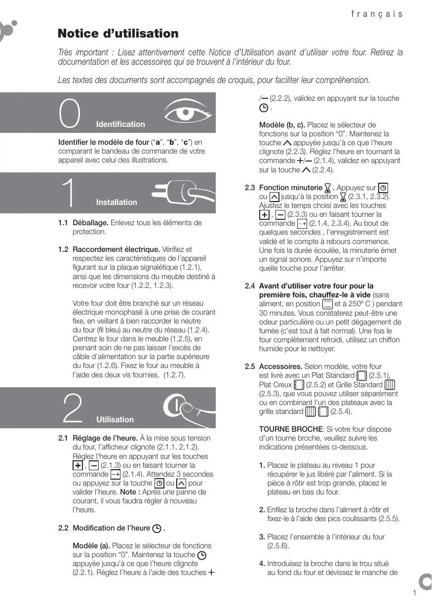 français Notice d’utilisation Très important : Lisez attentivement cette Notice d’Utilisation avant d’utiliser votre four. Retirez la documentation et les accessoires qui se trouvent à l’intérieur du four. Les textes des documents sont accompagnés de croquis, pour faciliter leur compréhension.
