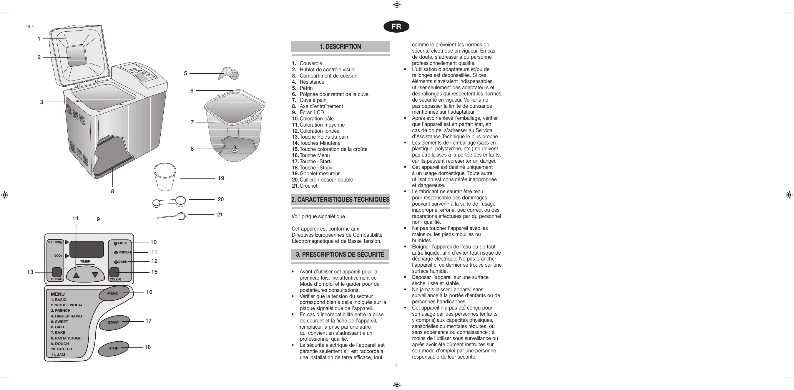 Veillez à ne pas laisser les enfants jouer avec l'appareil. Pour une plus grande protection, il est recommandé d'installer un dispositif de courant résiduel (RCD) à courant résiduel opérationnel ne dépassant pas les 30 mA. Consultez votre installateur. Ne pas abandonner l'appareil allumé, car il peut représenter une source de danger. Pour débrancher la fiche, ne jamais tirer sur le cordon. Débrancher l'appareil avant d'effectuer toute opération de nettoyage ou de maintenance. En cas de panne et/ou de mauvais fonctionnement de l'appareil, éteindre ce dernier et ne pas essayer de le réparer. S'il requiert une réparation, s'adresser uniquement à un Service d'Assistance Technique agréé par le fabricant et demander à utiliser des pièces de rechange originales. Si le cordon de l'appareil est endommagé, s'adresser à un Service d'Assistance Technique agréé par le fabricant pour le faire remplacer. Ne pas le laisser cet appareil exposé aux intempéries (pluie, soleil, givre, etc.). Ne pas utiliser l'appareil et ne placer aucune de ses parties sur des surfaces chaudes ou près de celles-ci (plaques de cuisson à gaz ou électriques ou fours). Ne pas utiliser de produits abrasifs pour nettoyer l'appareil. Ne pas toucher les parties chaudes de l'appareil. Saisir toujours l'appareil par la poignée. Éviter que le cordon ne touche les parties chaudes de l'appareil. Utilisez toujours des maniques pour ne pas vous brûler. Laissez refroidir complètement la machine avant de procéder à son entretien. Ne plongez pas la machine dans l'eau ni dans un quelconque autre liquide. Pour ajouter des ingrédients, retirez toujours préalablement la cuve du compartiment de cuisson. Ne faites jamais fonctionner la machine à vide, pour éviter de l'endommager sérieusement.