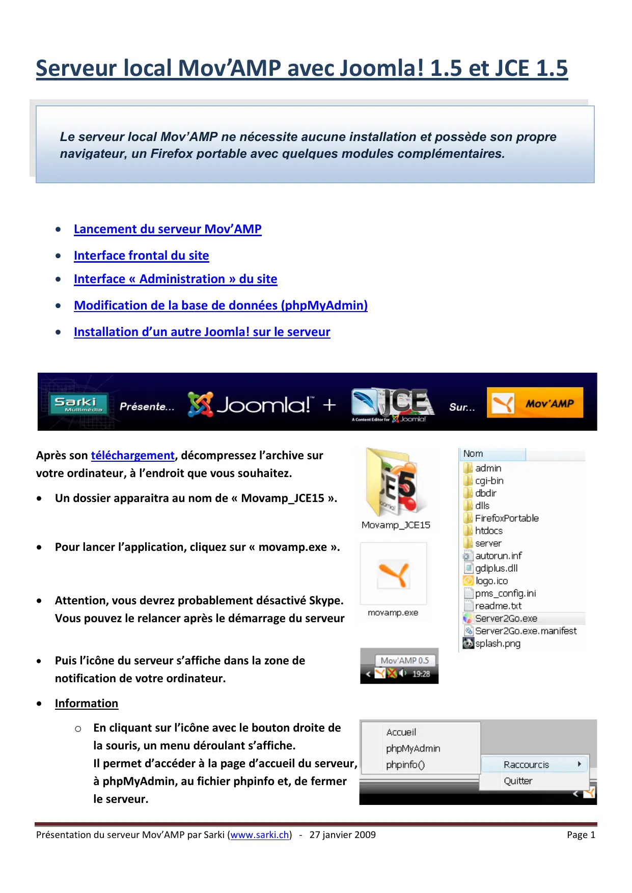 Si vous ne connaissez pas la procédure d’installation, Téléchargez le « Guide d'installation de Joomla 1.5 ». Présentation du serveur Mov’AMP par Sarki (www.sarki.ch) - 27 janvier 2009 Page 6 Pour toutes informations complémentaires… Présentation FR de JCE 1.5 : www.sarki.ch/jce15 Le site de l’auteur de JCE : www.joomlacontenteditor.net Le portail Francophone de Joomla! : www.joomla.fr Le site de l’auteur du serveur Mov’AMP : www.movamp.net Ce document, le contenu de ce « site présentation » et la page d’accueil du serveur sont réalisés par « Sarki ». Leur utilisation est libre, mais leur commercialisation est strictement interdite. www.sarki.ch - info@sarki.ch Présentation du serveur Mov’AMP par Sarki (www.sarki.ch) - 27 janvier 2009 Page 7