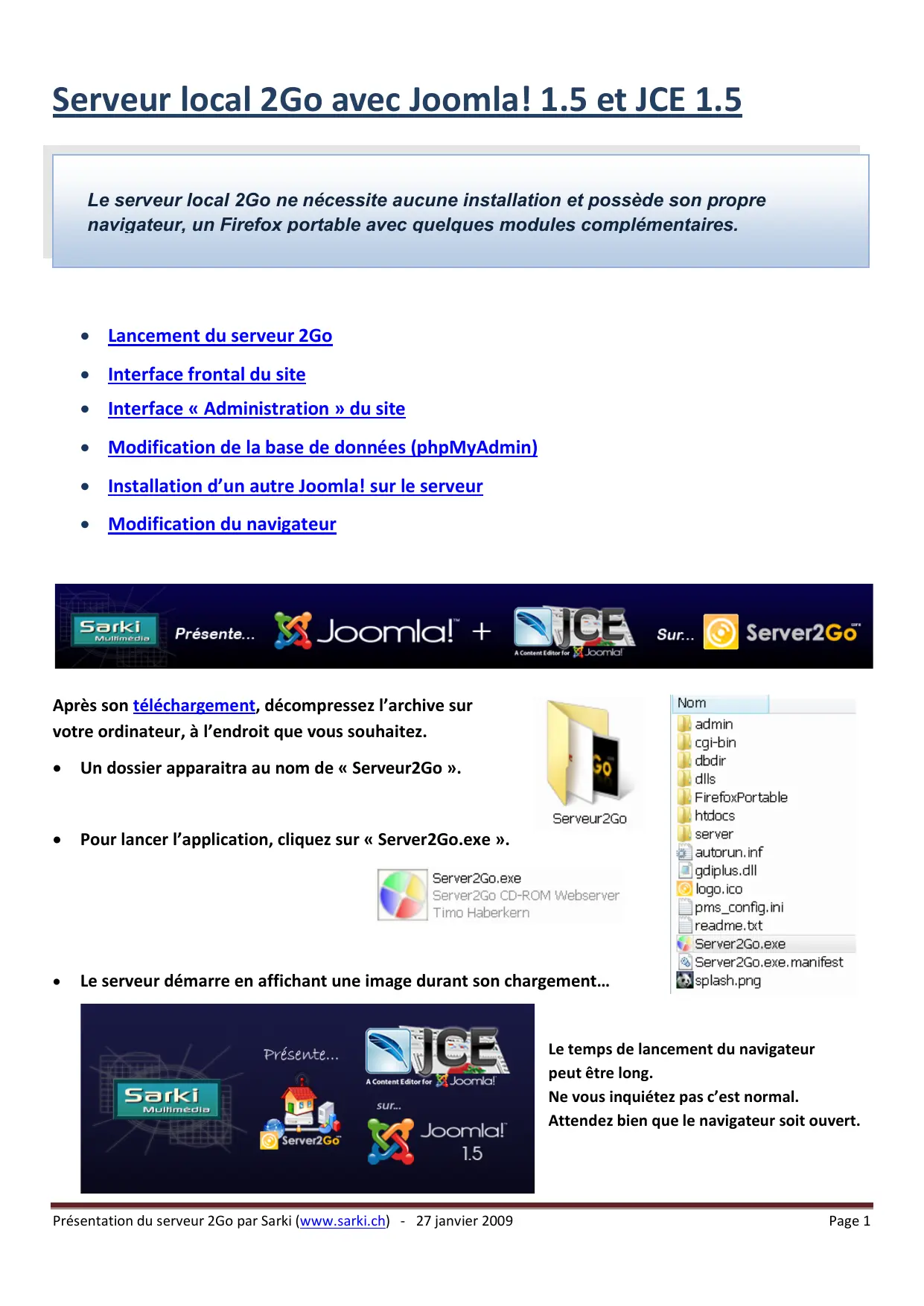 Le serveur démarre en affichant une image durant son chargement… Le temps de lancement du navigateur peut être long. Ne vous inquiétez pas c’est normal. Attendez bien que le navigateur soit ouvert. Présentation du serveur 2Go par Sarki (www.sarki.ch) - 27 janvier 2009 Page 1