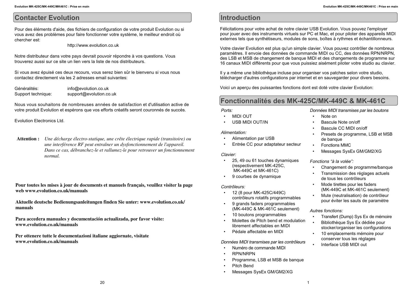 Félicitations pour votre achat de notre clavier USB Evolution. Vous pouvez l'employer pour jouer avec des instruments virtuels sur PC et Mac, et pour piloter des apparciels MIDI externes tels que synthétiseurs, modules de sons, boîtes à rythmes et échantillonneurs.