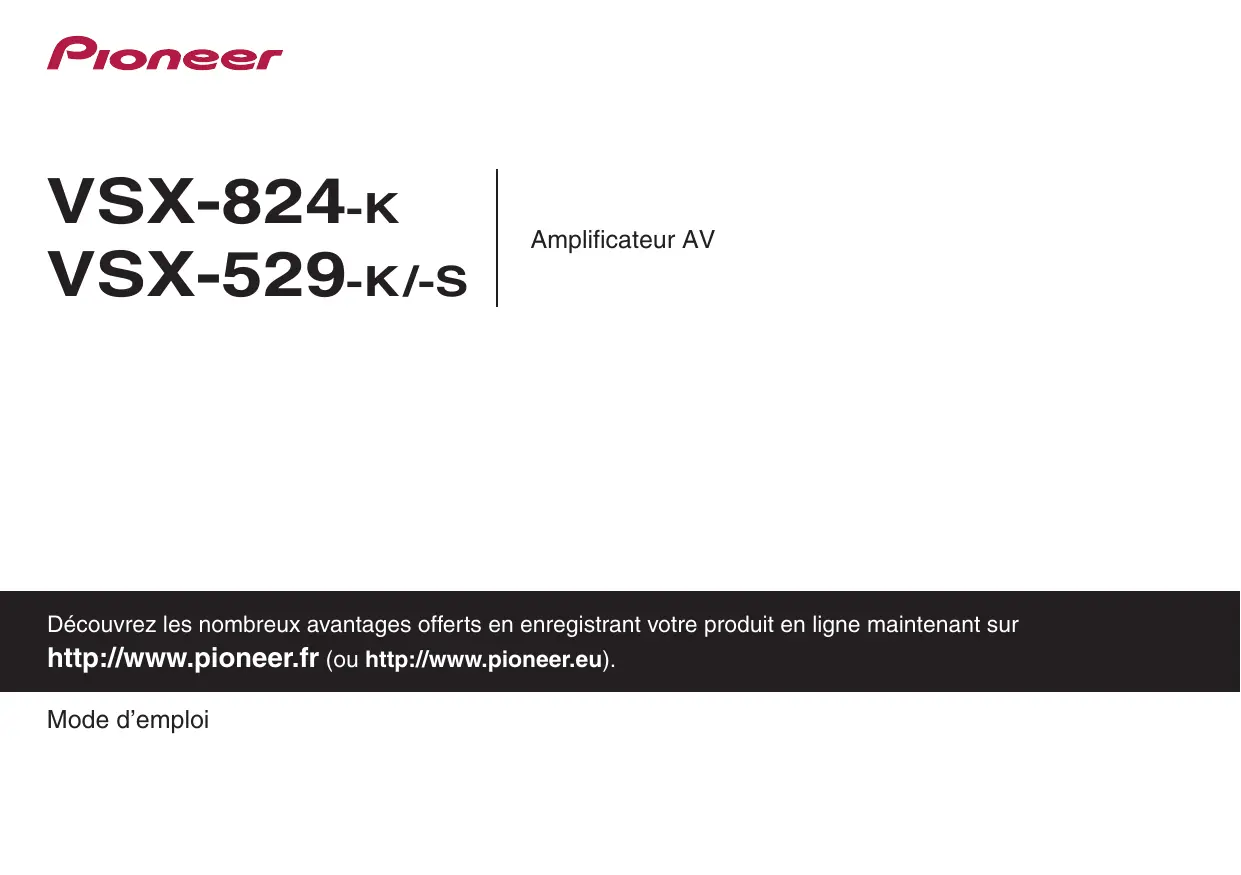 Amplificateur AV Découvrez les nombreux avantages offerts en enregistrant votre produit en ligne maintenant sur http://www.pioneer.fr (ou http://www.pioneer.eu). Mode d’emploi ATTENTION POUR ÉVITER TOUT RISQUE D’ÉLECTROCUTION, NE PAS ENLEVER LE COUVERCLE (NI LE PANNEAU ARRIÈRE). AUCUNE PIÈCE RÉPARABLE PAR L’UTILISATEUR NE SE TROUVE À L’INTÉRIEUR.