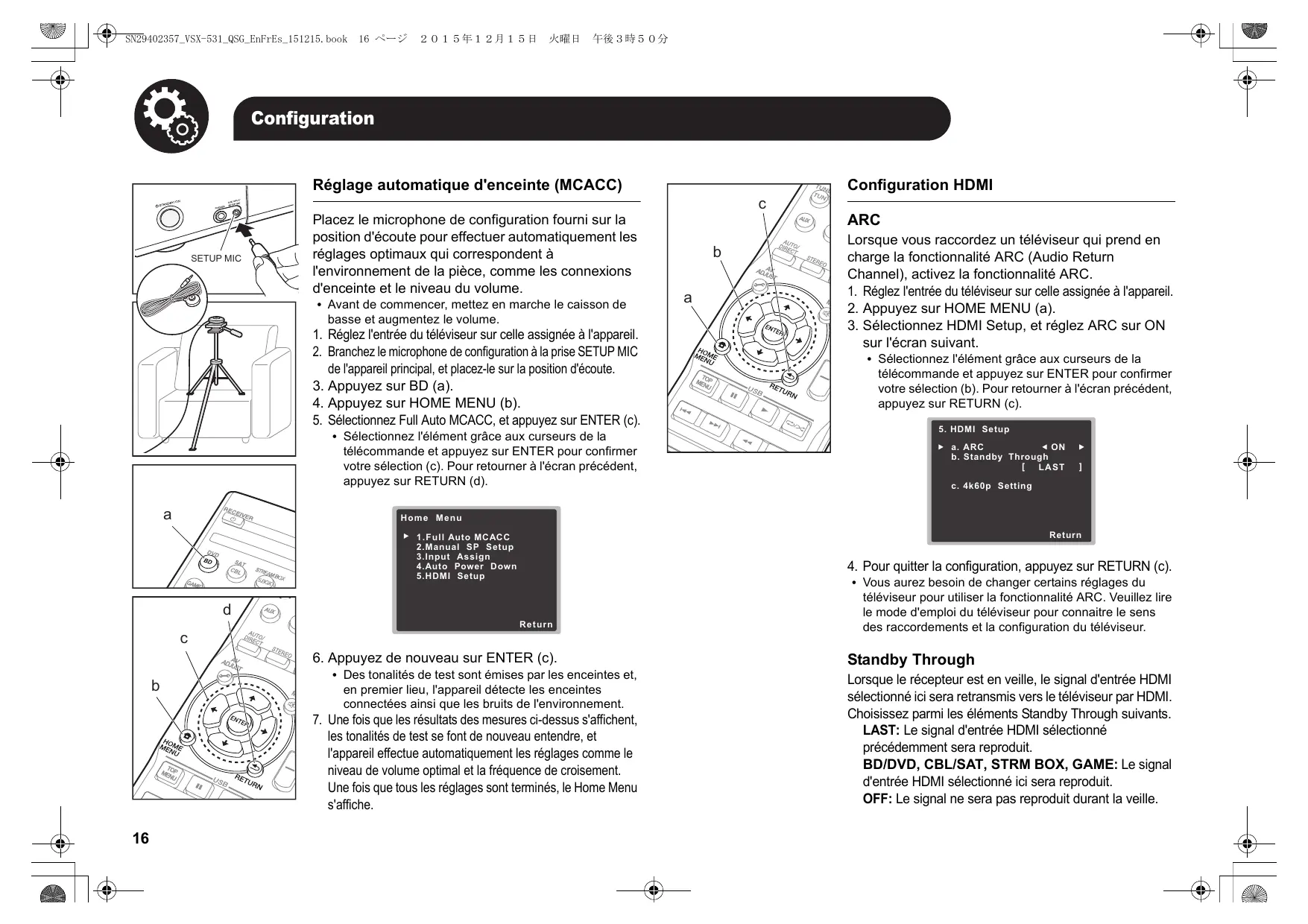 Channel), activez la fonctionnalité ARC. 1. Réglez l'entrée du téléviseur sur celle assignée à l'appareil. 2. Appuyez sur HOME MENU (a). 3. Sélectionnez HDMI Setup, et réglez ARC sur ON sur l'écran suivant. 0 Sélectionnez l'élément grâce aux curseurs de la télécommande et appuyez sur ENTER pour confirmer votre sélection (b). Pour retourner à l'écran précédent, appuyez sur RETURN (c). 5. HDMI Setup ON a. ARC b. Standby Through [ LAST