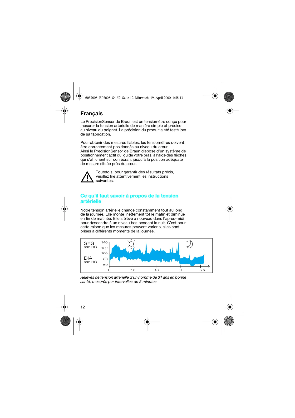 Français Le PrecisionSensor de Braun est un tensiomètre conçu pour mesurer la tension artérielle de manière simple et précise au niveau du poignet. La précision du produit a été testé lors de sa fabrication. Pour obtenir des mesures fiables, les tensiomètres doivent être correctement positionnés au niveau du cœur. Ainsi le PrecisionSensor de Braun dispose d’un système de positionnement actif qui guide votre bras, à l’aide des flèches qui s’affichent sur con écran, jusqu’à la position adéquate de mesure située près du cœur. Toutefois, pour garantir des résultats précis, veuillez lire attentivement les instructions suivantes. Ce qu’il faut savoir à propos de la tension artérielle Notre tension artérielle change constamment tout au long de la journée. Elle monte nettement tôt le matin et diminue en fin de matinée. Elle s'élève à nouveau dans l'après-midi pour descendre à un niveau bas pendant la nuit. C’est pour cette raison que les mesures peuvent varier si elles sont prises à différents moments de la journée. SYS