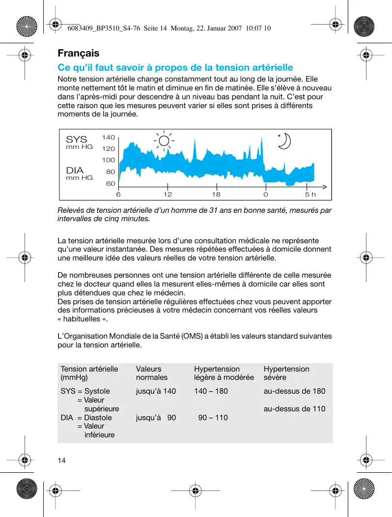 6083409_BP3510_S4-76 Seite 14 Montag, 22. Januar 2007 10:07 10 Français Ce qu’il faut savoir à propos de la tension artérielle Notre tension artérielle change constamment tout au long de la journée. Elle monte nettement tôt le matin et diminue en fin de matinée. Elle s’élève à nouveau dans l’après-midi pour descendre à un niveau bas pendant la nuit. C’est pour cette raison que les mesures peuvent varier si elles sont prises à différents moments de la journée. SYS