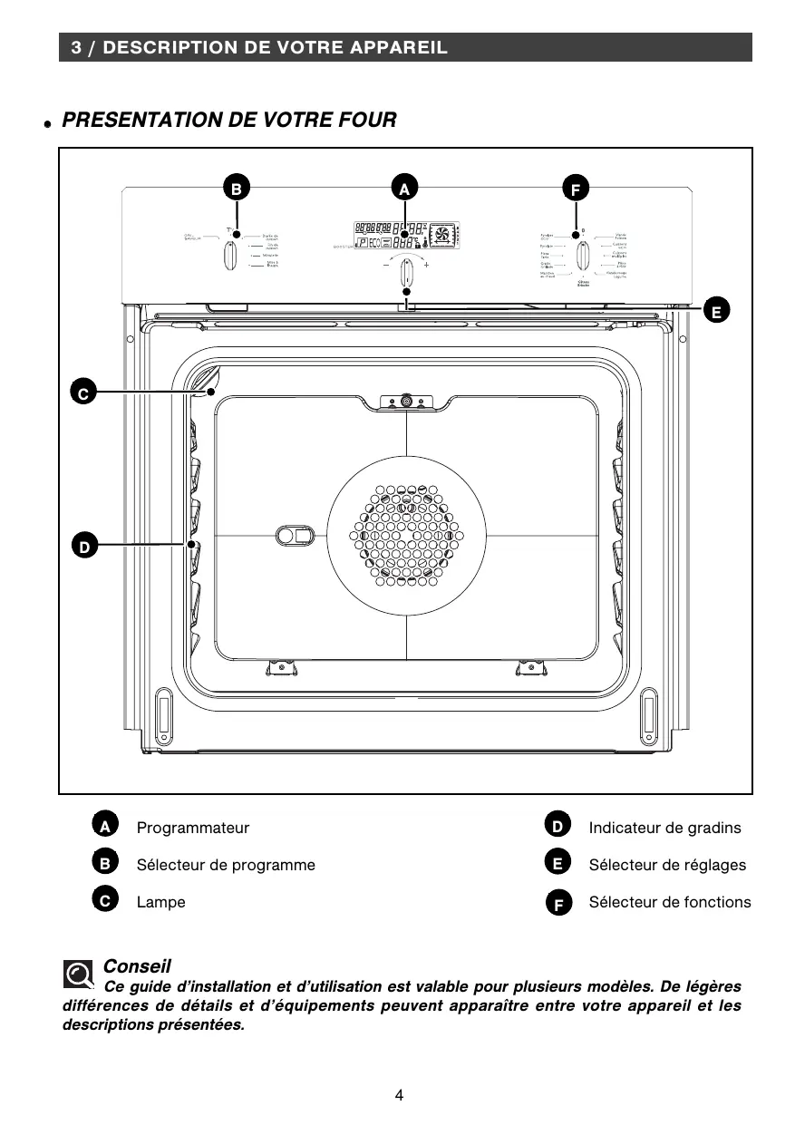 Sélecteur de fonctions Conseil Ce guide d’installation et d’utilisation est valable pour plusieurs modèles. De légères différences de détails et d’équipements peuvent apparaître entre votre appareil et les descriptions présentées.
