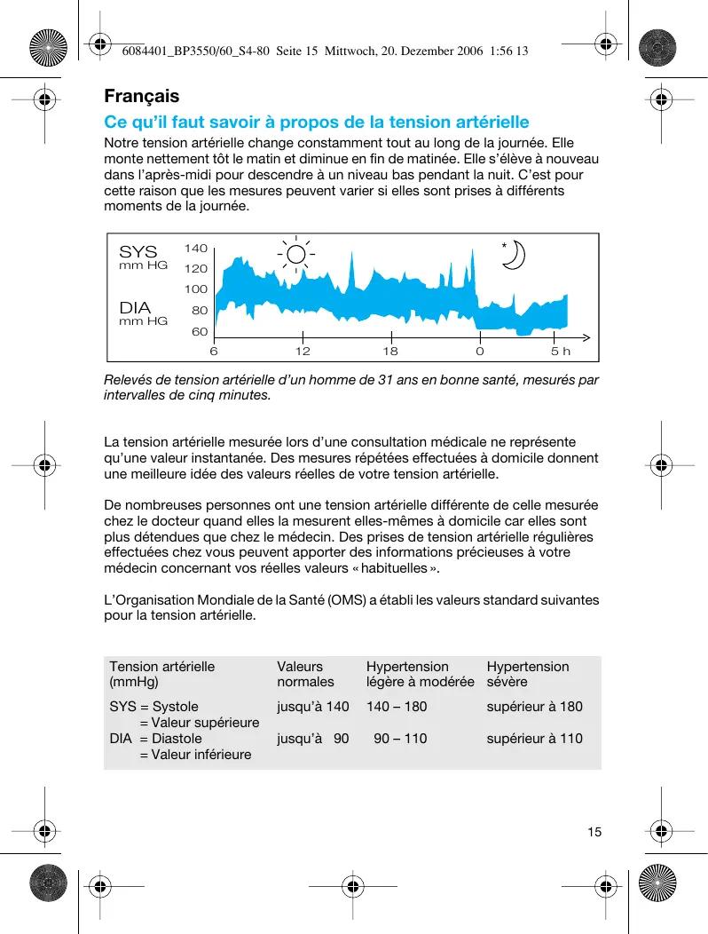 Français Ce qu’il faut savoir à propos de la tension artérielle Notre tension artérielle change constamment tout au long de la journée. Elle monte nettement tôt le matin et diminue en fin de matinée. Elle s’élève à nouveau dans l’après-midi pour descendre à un niveau bas pendant la nuit. C’est pour cette raison que les mesures peuvent varier si elles sont prises à différents moments de la journée. SYS