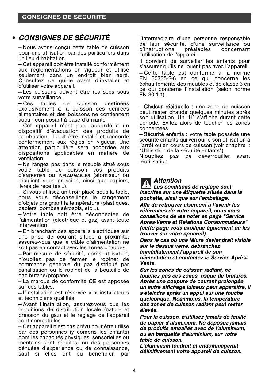 - CONSIGNES DE SÉCURITÉ l’intermédiaire d’une personne responsable de leur sécurité, d’une surveillance ou d’instructions préalables concernant l’utilisation de l’appareil. Il convient de surveiller les enfants pour s’assurer qu’ils ne jouent pas avec l’appareil. — Cette table est conforme à la norme EN 60335-2-6 en ce qui concerne les échauffements des meubles et de classe 3 en ce qui concerne l’installation (selon norme EN 30-1-1). — Nous avons conçu cette table de cuisson pour une utilisation par des particuliers dans un lieu d’habitation. — Cet appareil doit être installé conformément aux règlementations en vigueur et utilisé seulement dans un endroit bien aéré. Consultez ce guide avant d’installer et d’utiliser votre appareil. — Les cuissons doivent être réalisées sous votre surveillance. — Ces tables de cuisson destinées exclusivement à la cuisson des denrées alimentaires et des boissons ne contiennent aucun composant à base d’amiante. — Cet appareil n’est pas raccordé à un dispositif d’évacuation des produits de combustion. Il doit être installé et raccordé conformément aux règles en vigueur. Une attention particulière sera accordée aux dispositions applicables en matière de ventilation. — Ne rangez pas dans le meuble situé sous votre table de cuisson vos produits d’ENTRETIEN ou INFLAMMABLES (atomiseur ou récipient sous pression, ainsi que papiers, livres de recettes...). — Si vous utilisez un tiroir placé sous la table, nous vous déconseillons le rangement d’objets craignant la température (plastiques, papiers, bombes aérosols, etc...). — Votre table doit être déconnectée de l’alimentation (électrique et gaz) avant toute intervention. — En branchant des appareils électriques sur une prise de courant située à proximité, assurez-vous que le câble d’alimentation ne soit pas en contact avec les zones chaudes. — Par mesure de sécurité, après utilisation, n’oubliez pas de fermer le robinet de commande générale du gaz distribué par canalisation ou le robinet de la bouteille de gaz butane/propane. — La marque de conformité CE est apposée sur ces tables. — L’installation est réservée aux installateurs et techniciens qualifiés. — Avant l’installation, assurez-vous que les conditions de distribution locale (nature et pression du gaz) et le réglage de l’appareil sont compatibles. — Cet appareil n’est pas prévu pour être utilisé par des personnes (y compris les enfants) dont les capacités physiques, sensorielles ou mentales sont réduites, ou des personnes dénuées d’expérience ou de connaissance, sauf si elles ont pu bénéficier, par — Chaleur résiduelle : une zone de cuisson peut rester chaude quelques minutes après son utilisation. Un “H” s’affiche durant cette période. Evitez alors de toucher les zones concernées. — Sécurité enfants : votre table possède une sécurité enfants qui verrouille son utilisation à l’arrêt ou en cours de cuisson (voir chapitre : “Utilisation de la sécurité enfants”). N’oubliez pas de déverrouiller avant réutilisation. Attention Les conditions de réglage sont inscrites sur une étiquette située dans la pochette, ainsi que sur l’emballage. Afin de retrouver aisément à l’avenir les références de votre appareil, nous vous conseillons de les noter en page “Service Après-Vente et Relations Consommateurs” (cette page vous explique également où les trouver sur votre appareil). Dans le cas où une fêlure deviendrait visible sur le dessus verre, débranchez immédiatement l’appareil de son alimentation et contactez le Service AprèsVente. Sur les zones de cuisson radiant, ne touchez pas ces zones, risque de brûlures. Après une coupure de courant prolongée, un autre affichage luineux peut apparaître, il s’éteindra après un appui sur une touche quelconque. Néanmoins, la température des zones de cuisson radiant peut rester élevée. Pour la cuisson, n’utilisez jamais de feuille de papier d’aluminium. Ne déposez jamais de produits emballés avec de l’aluminium, ou en barquette d’aluminium, sur votre table de cuisson. L’aluminium fondrait et endommagerait définitivement votre appareil de cuisson.
