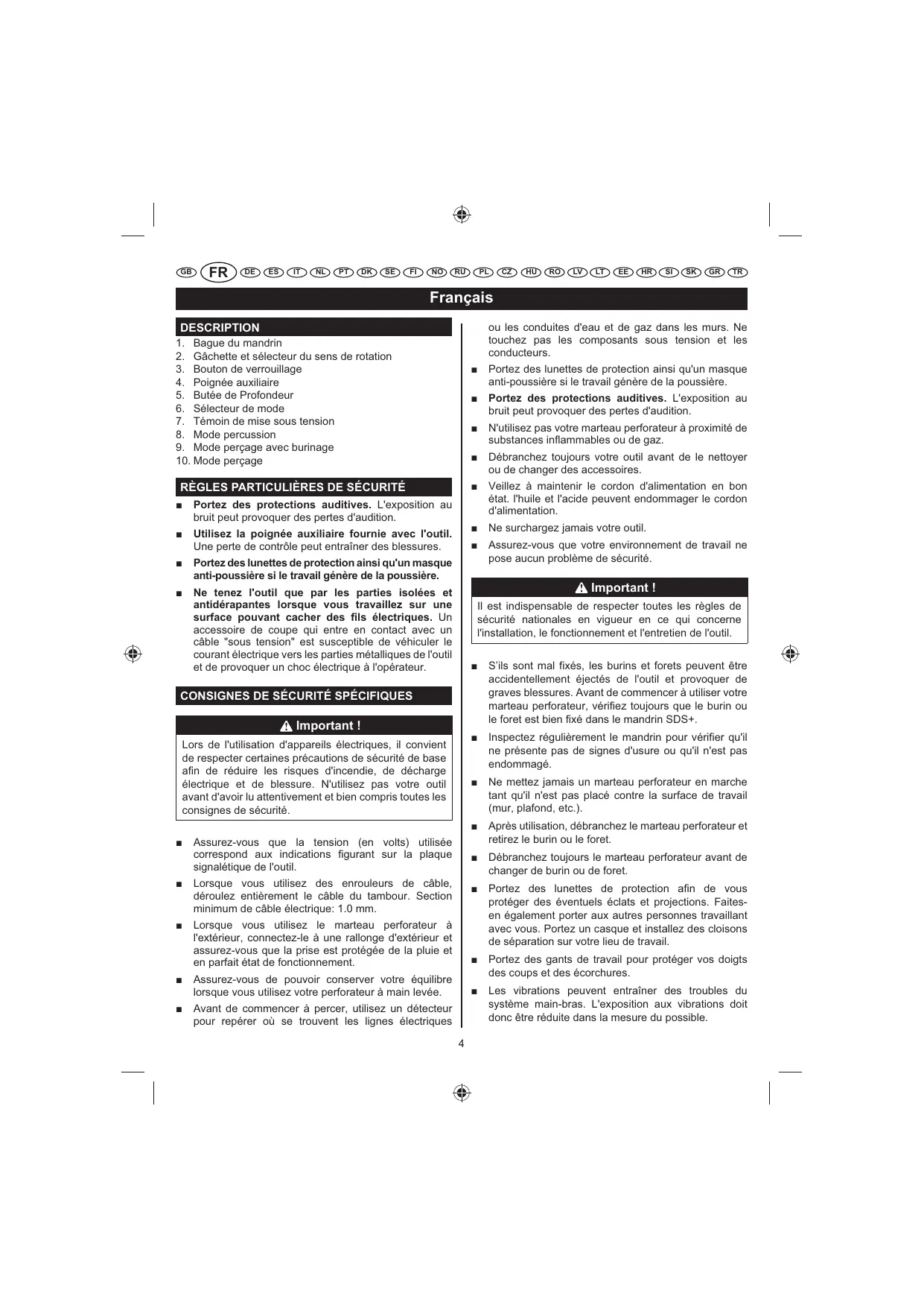 2. Gâchette et sélecteur du sens de rotation 3. Bouton de verrouillage 4. Poignée auxiliaire 5. Butée de Profondeur 6. Sélecteur de mode 7. Témoin de mise sous tension 8. Mode percussion 9. Mode perçage avec burinage 10. Mode perçage Assurez-vous que la tension (en volts) utilisée correspond aux indications figurant sur la plaque signalétique de l'outil.